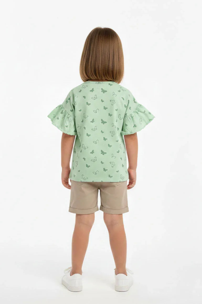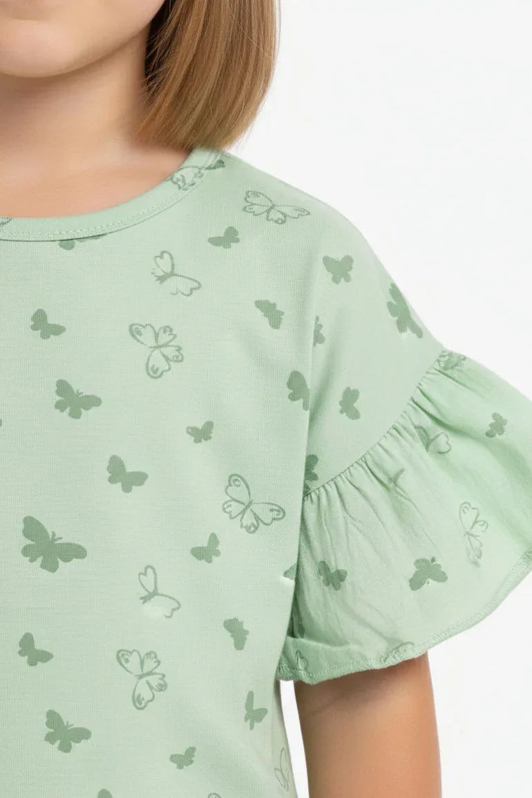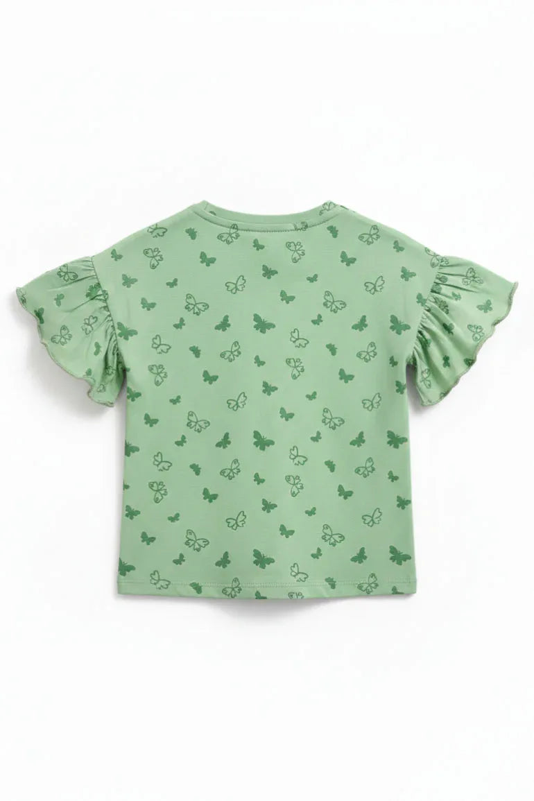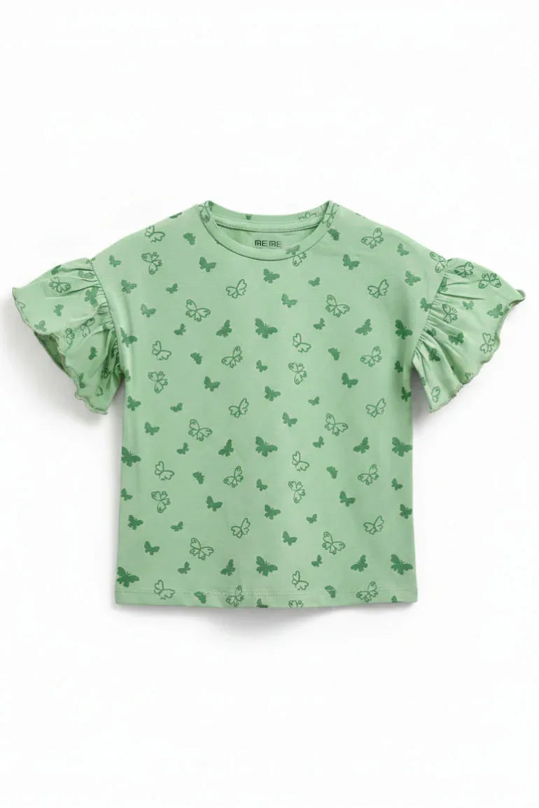 A charming mint green T-shirt featuring an all-over butterfly print and soft ruffle sleeves. Made from lightweight, breathable fabric, perfect for everyday wear, playtime, and cute casual styling.