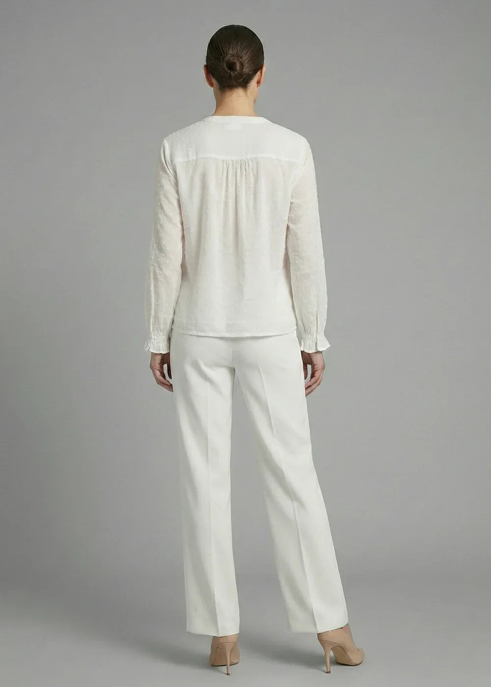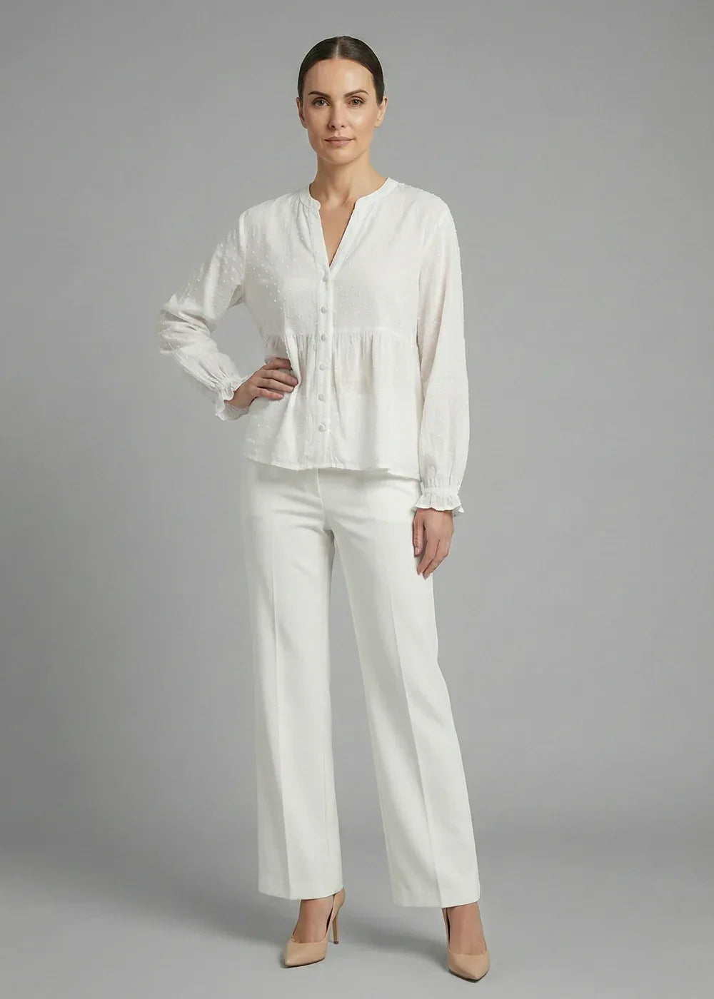 An elegant off-white blouse featuring a subtle textured fabric and a flattering peplum silhouette. Designed with soft gathers and cuffed sleeves, it offers effortless sophistication for work or casual chic styling. Lightweight, breathable, and easy to wear all day.