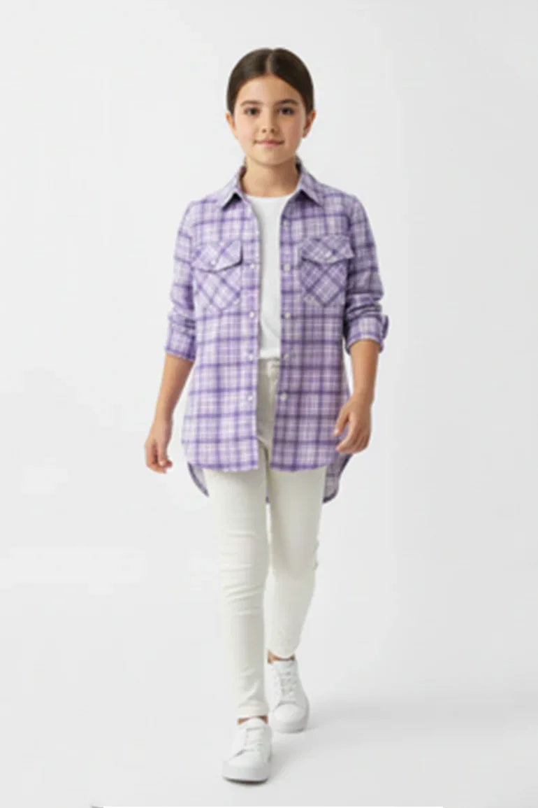 Button Down Check Shirt For Girl - Light Pastel Purple