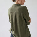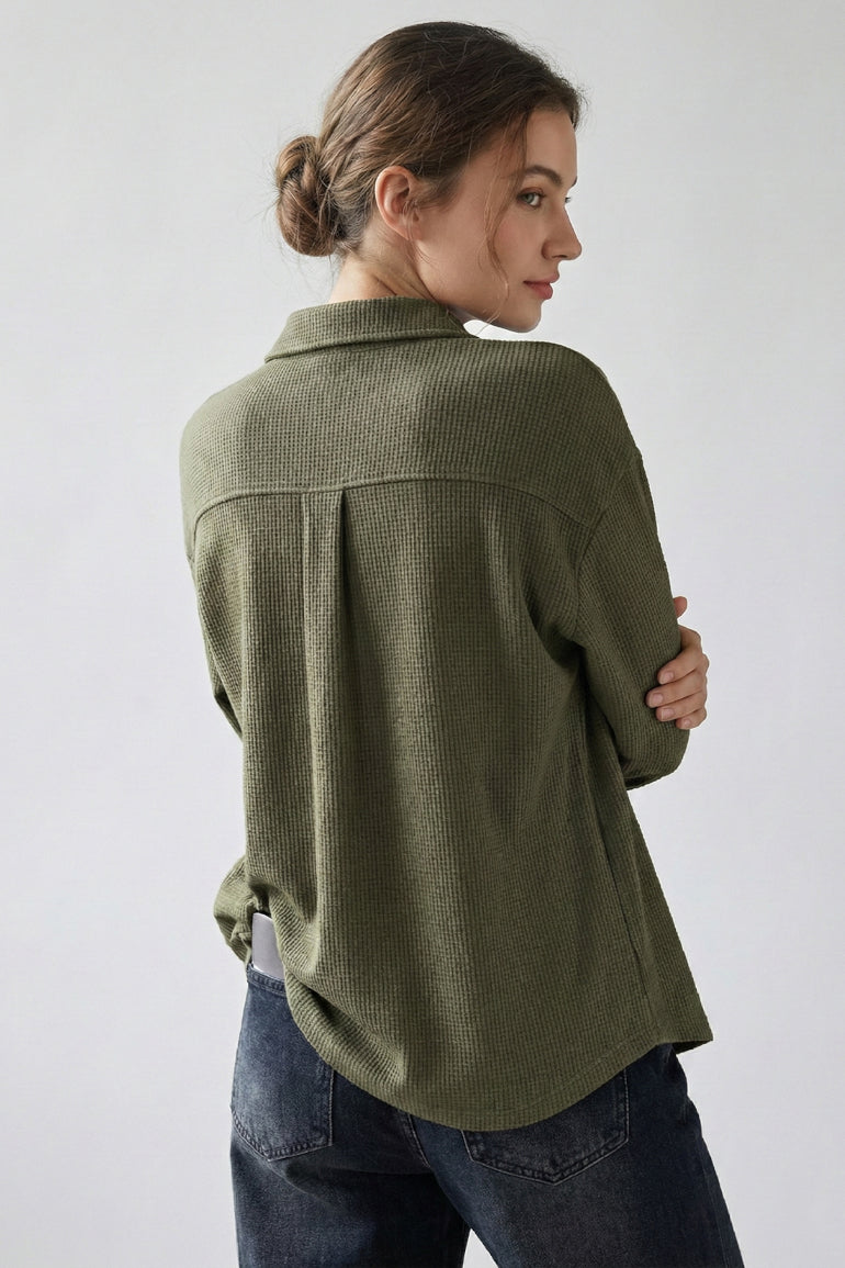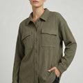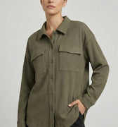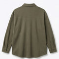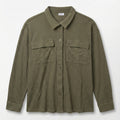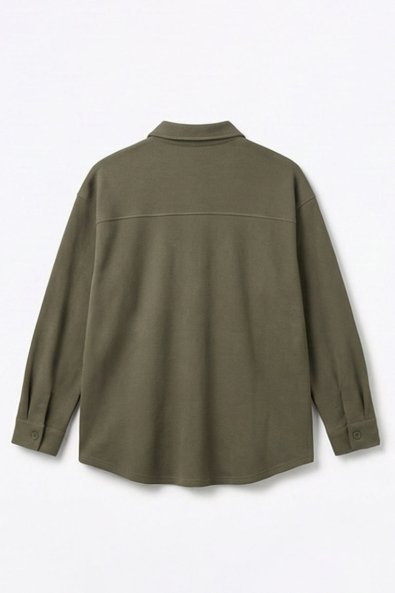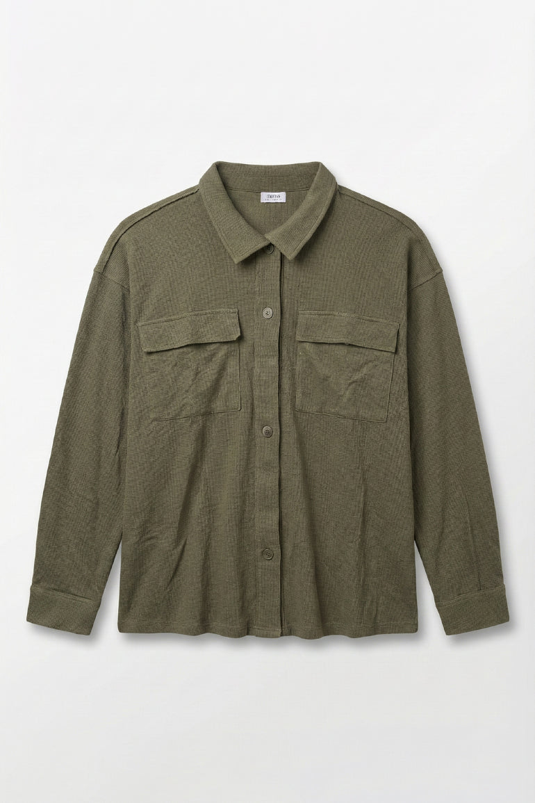 A versatile olive green utility shirt crafted from soft textured cotton. Featuring front flap pockets and a relaxed silhouette, it’s perfect for layering or wearing solo — a timeless blend of comfort and understated style for everyday wear.