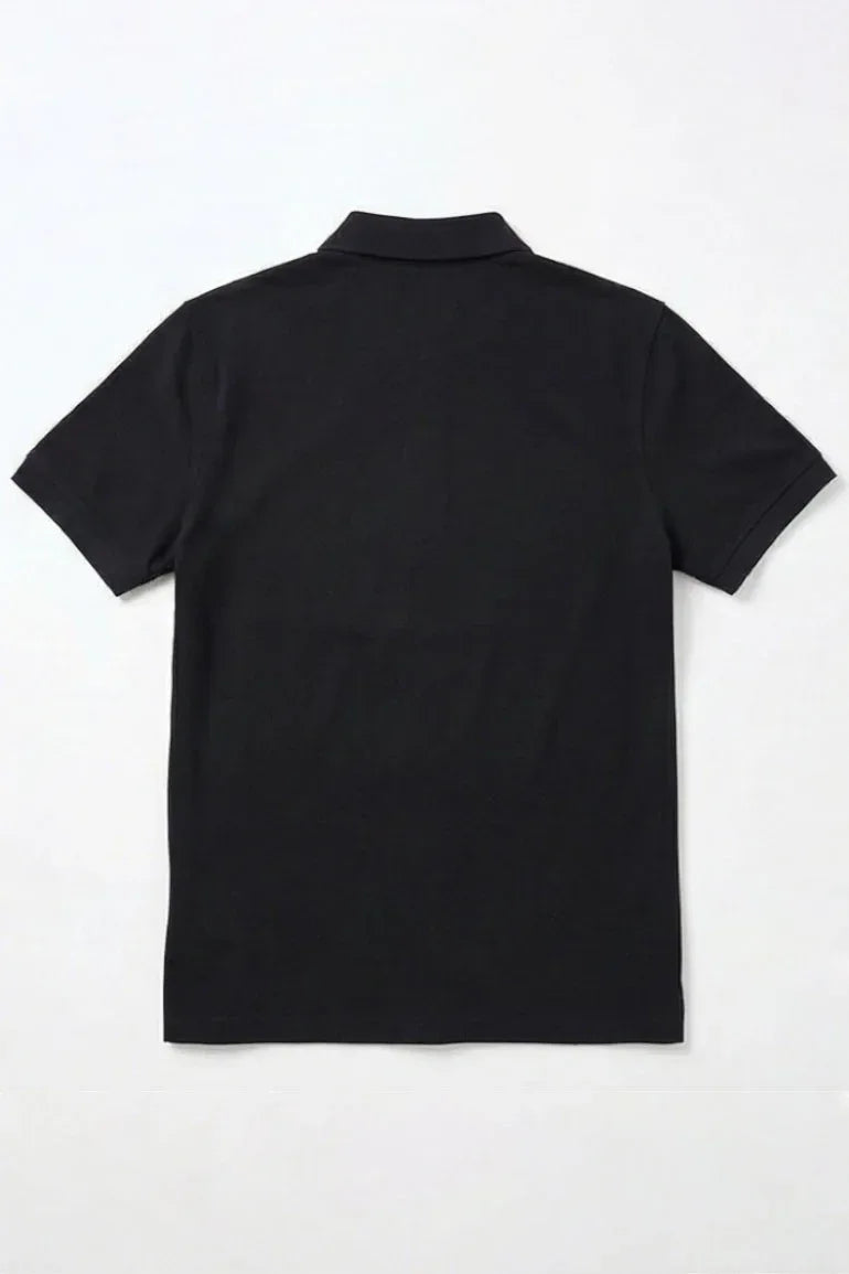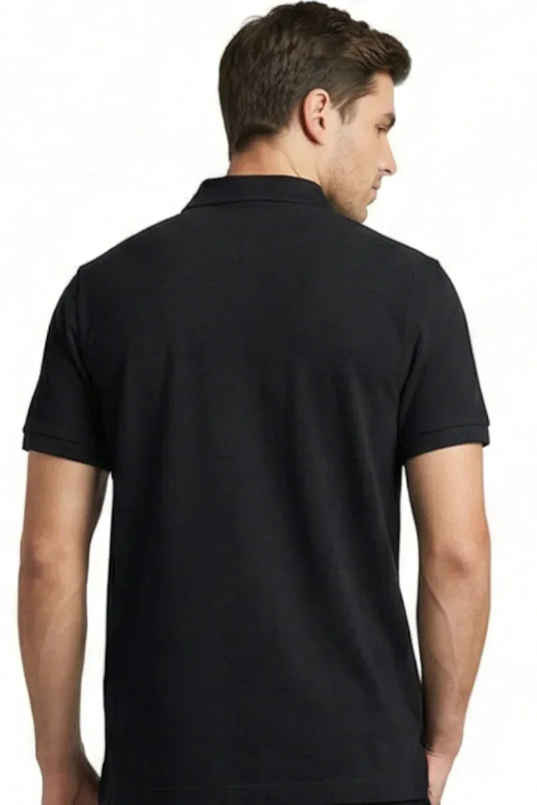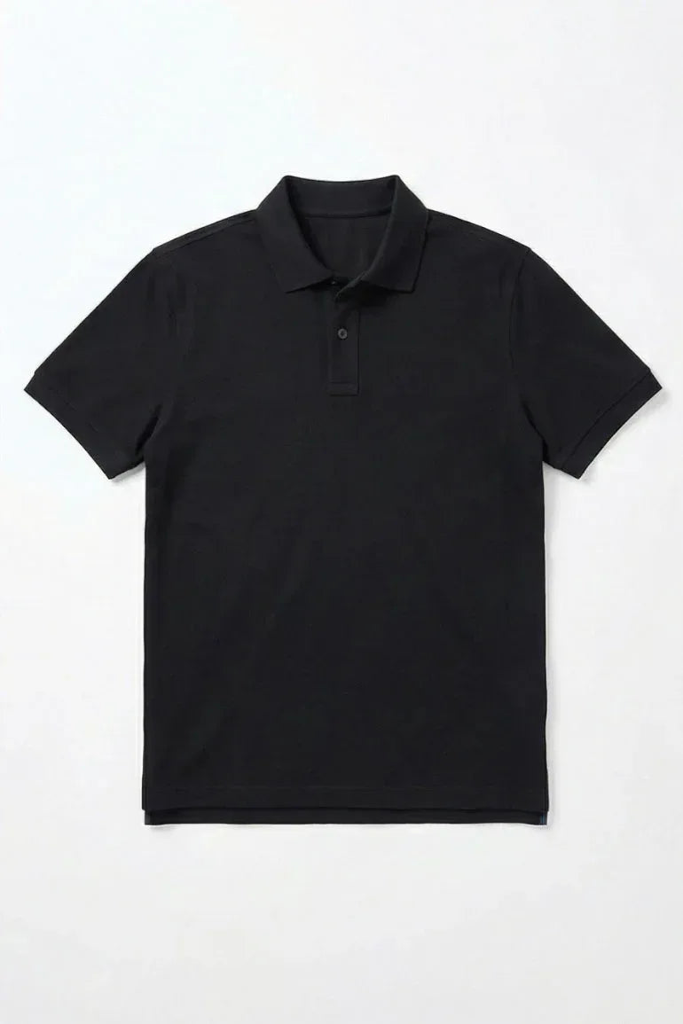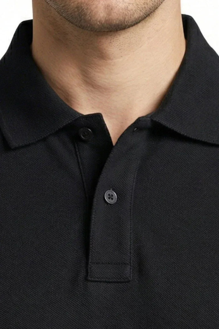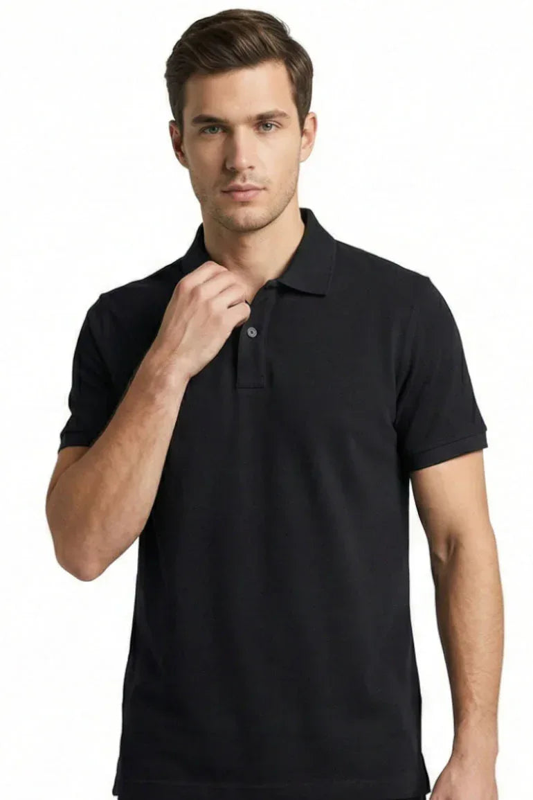 A timeless black polo T-shirt designed for a clean, smart-casual look. Made from soft, breathable fabric with a structured collar and button placket, perfect for everyday wear and effortless styling.