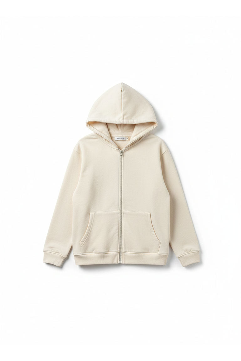 Clean white zip hoodie with a relaxed fit and front pockets. A versatile everyday essential perfect for layering in any season.