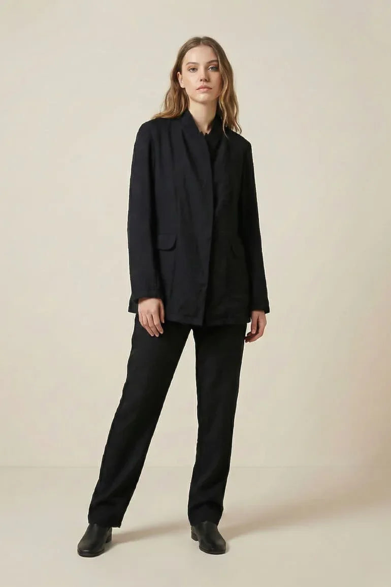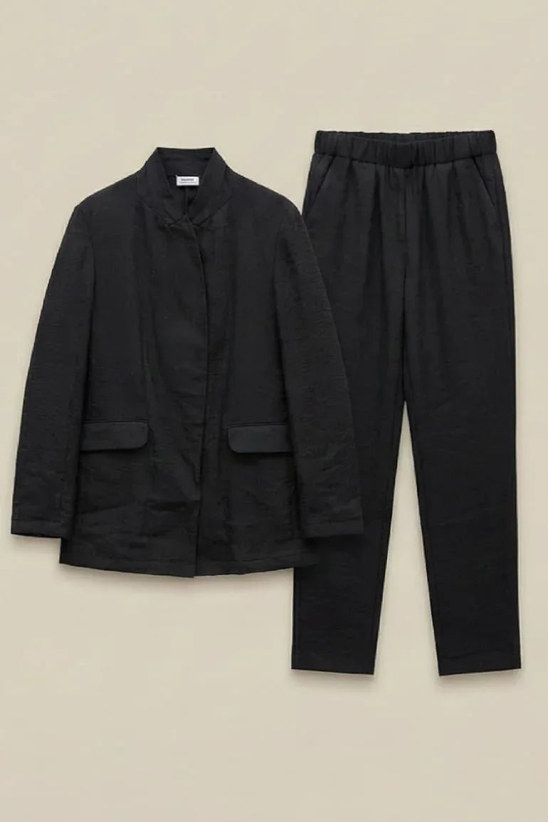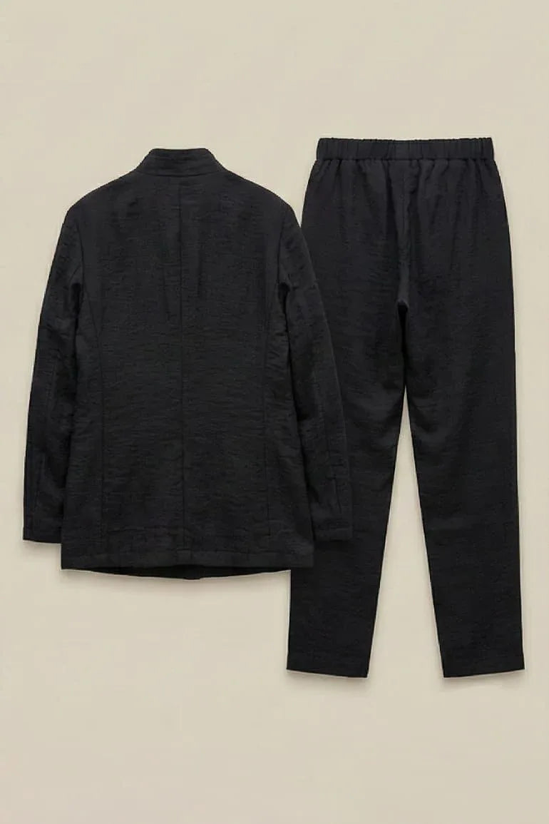 A sleek black co-ord set featuring a textured tailored jacket paired with matching straight-leg trousers. Designed for a refined yet modern look, it offers comfort, structure, and effortless elegance. Perfect for workwear, formal outings, or elevated everyday styling.