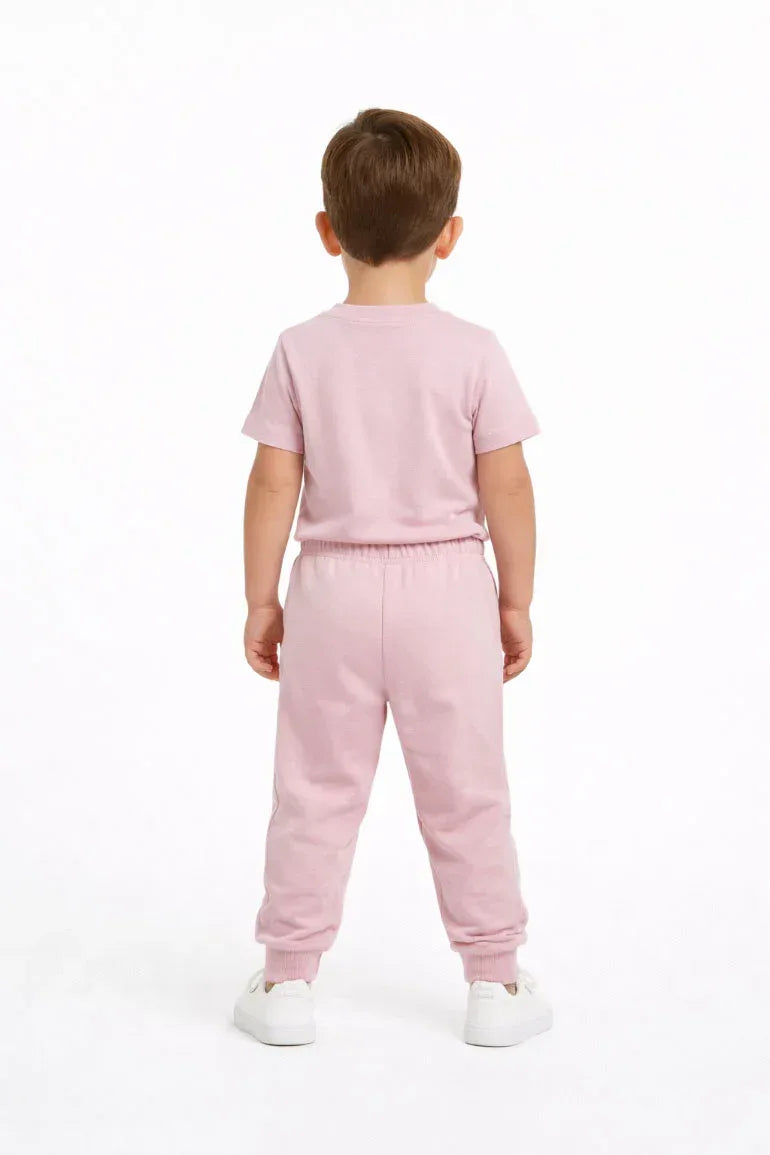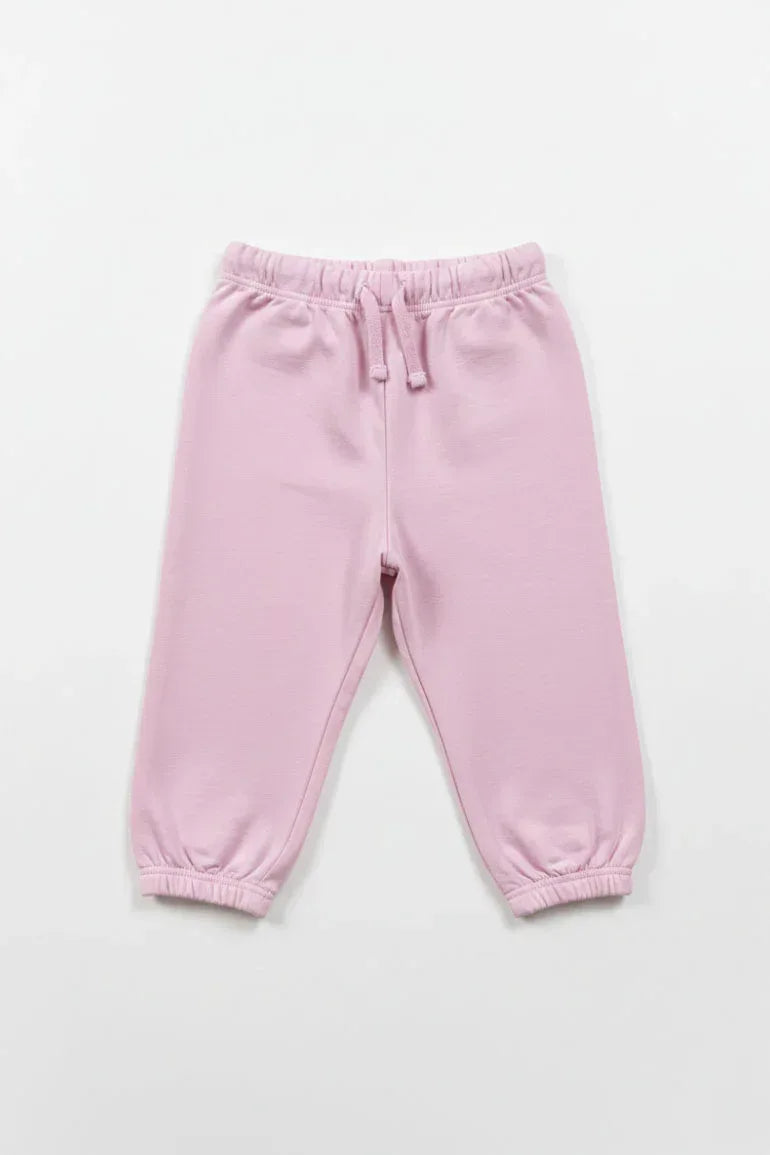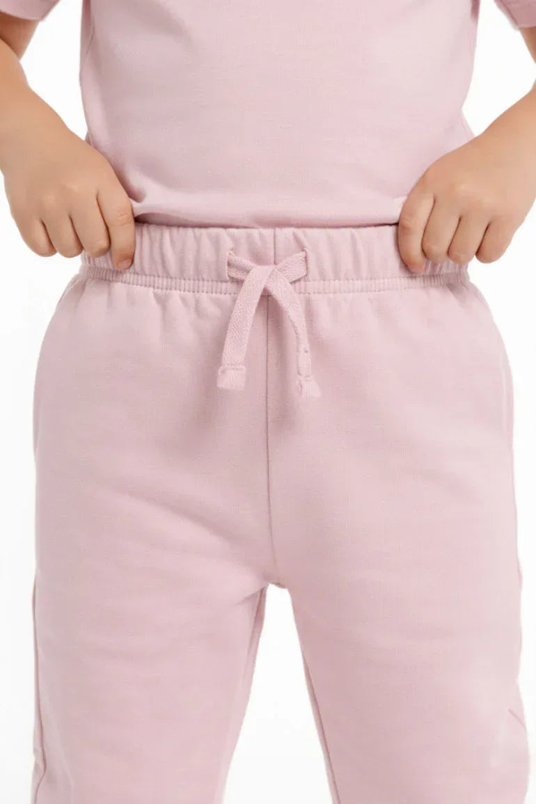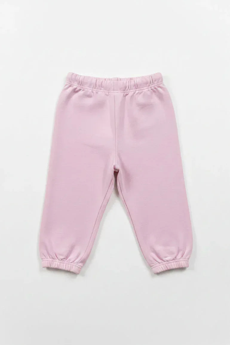 Soft pink jogger pants designed with a gentle elastic waistband and cuffed hems for a comfortable fit. Made from breathable, baby-friendly fabric, perfect for everyday wear, playtime, and lounging.
