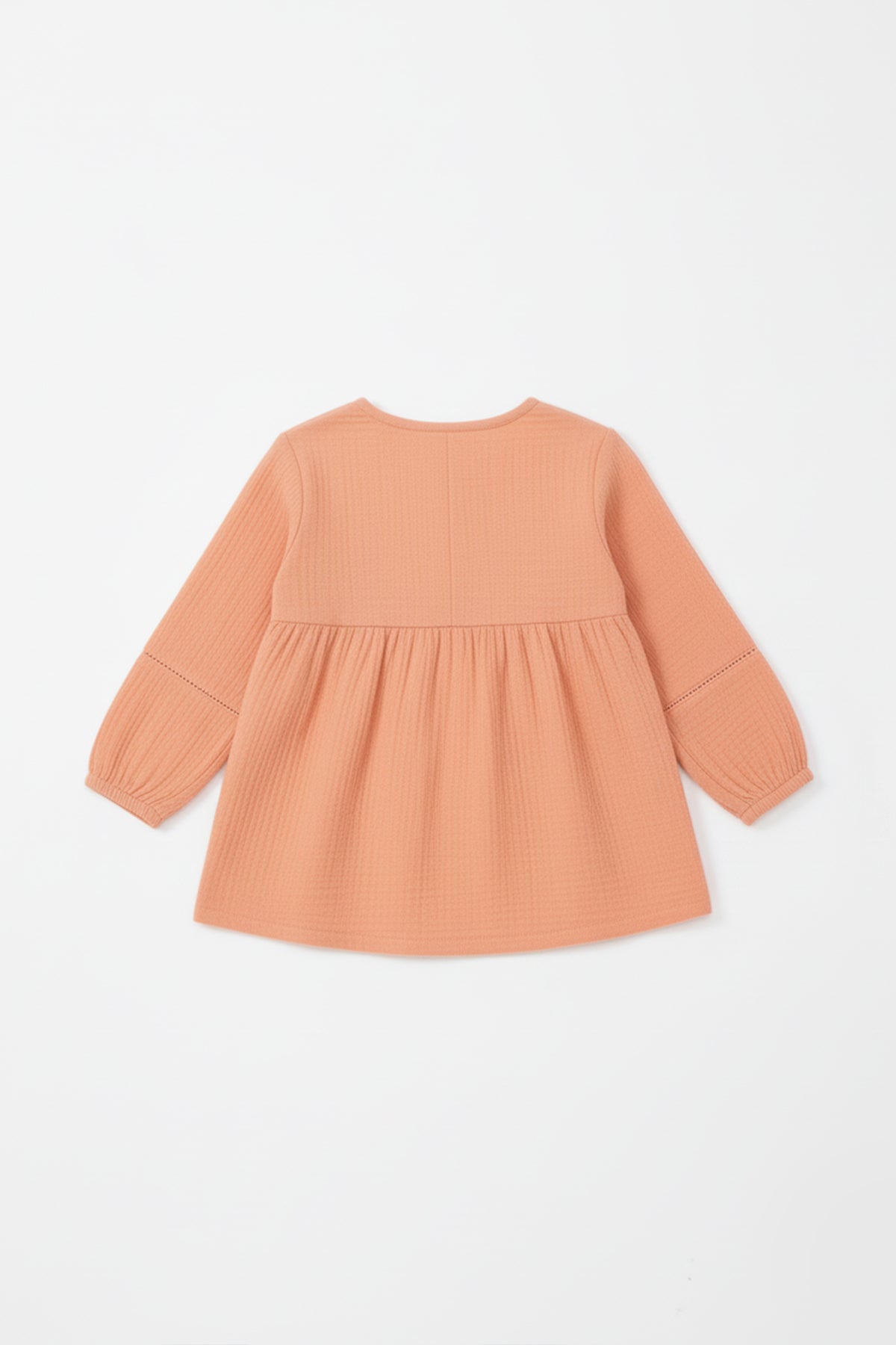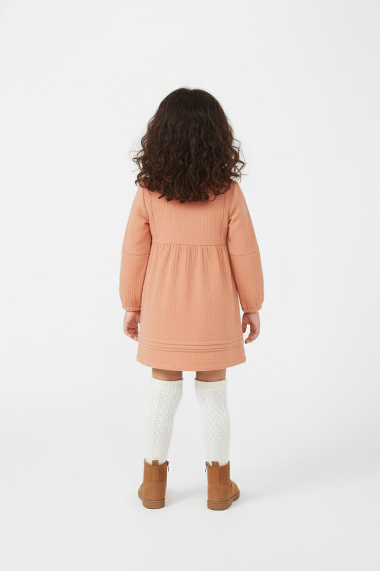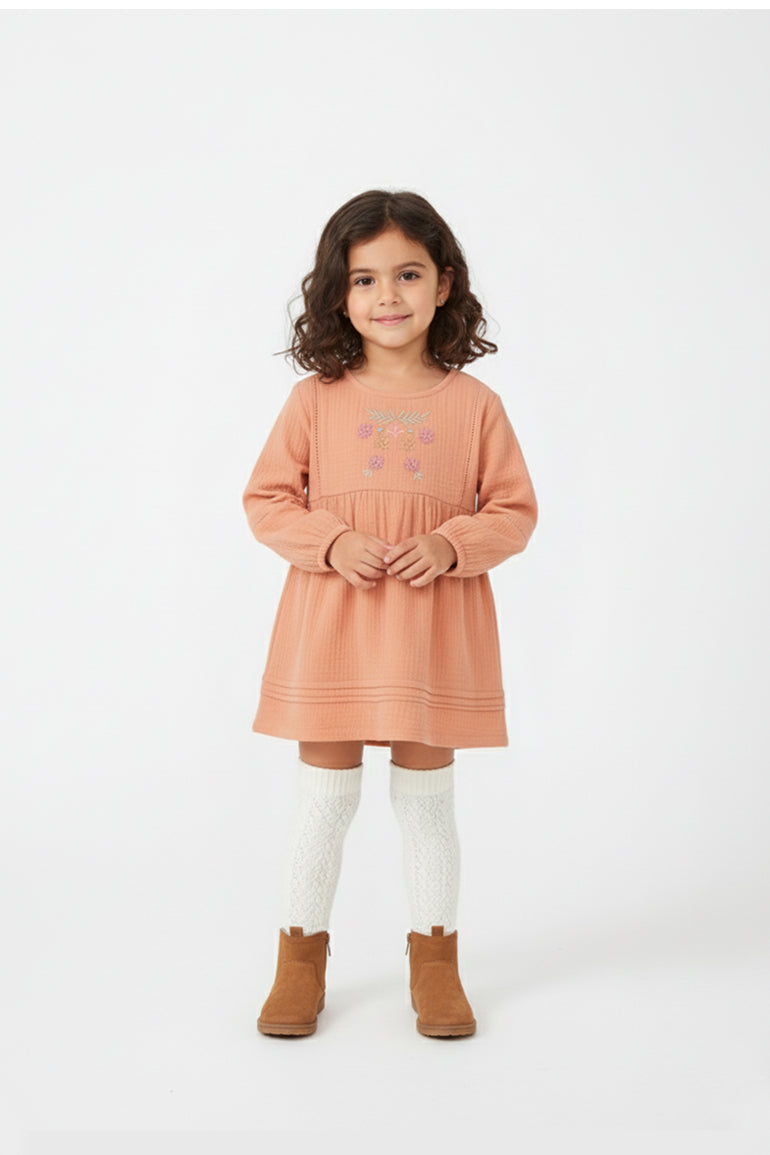 This peach embroidered dress brings comfort and charm together with its soft cotton fabric and delicate floral stitching. Featuring long sleeves with gathered cuffs and a flowy fit, it’s perfect for casual days, family outings, or festive occasions.