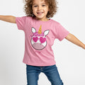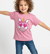 Add a pop of fun to your child’s wardrobe with this pink unicorn graphic t-shirt. Featuring a golden-horn unicorn with heart-shaped sunglasses, it’s playful, comfy, and perfect for everyday wear.