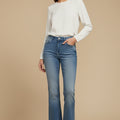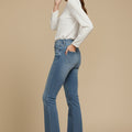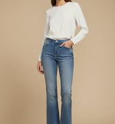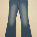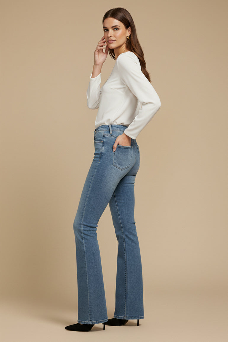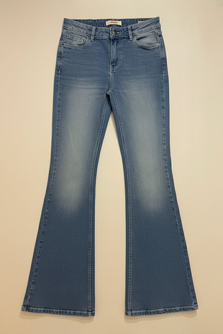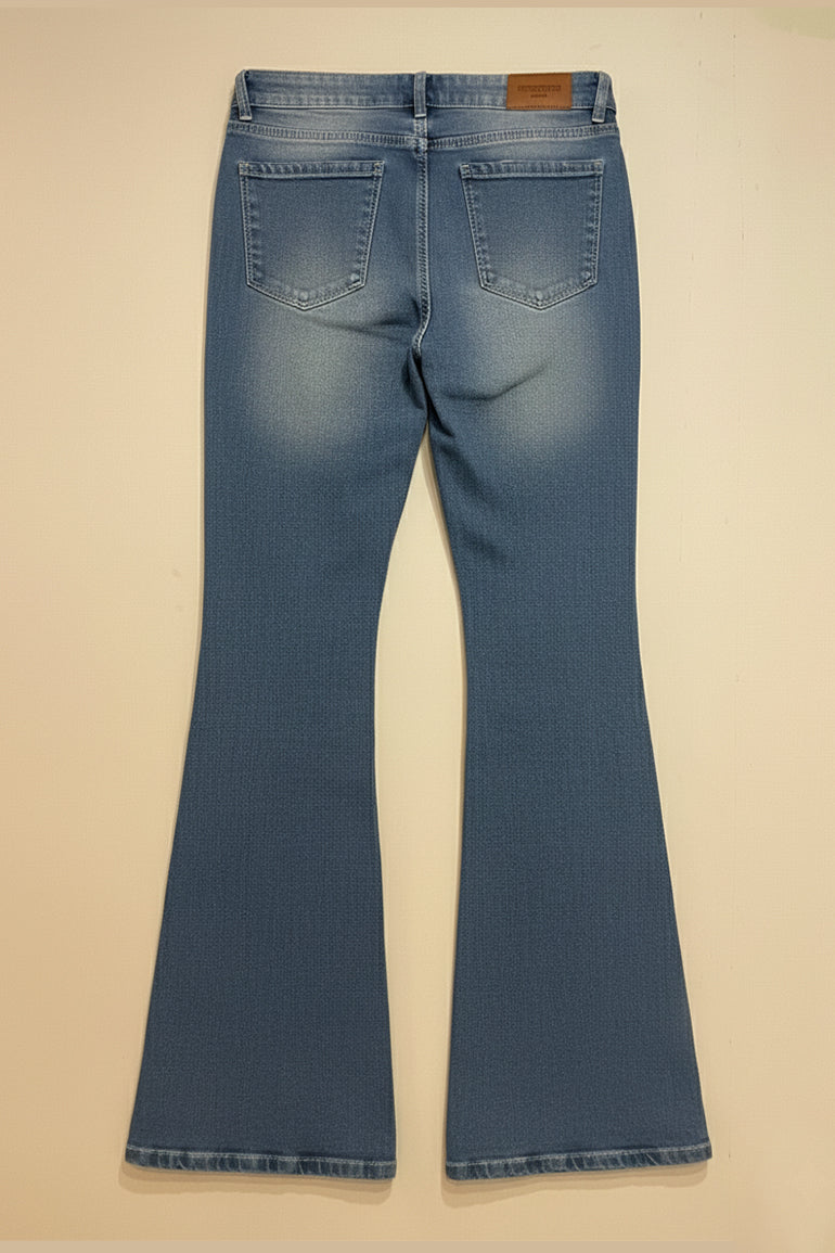These flared denim jeans offer a flattering retro-inspired silhouette with a modern touch. Designed in a soft stretch denim fabric, they feature a mid-rise waist, subtle faded detailing, and a smooth fit through the hips that widens into a gentle flare. Perfect for everyday wear, these jeans pair effortlessly with casual tees or dressy blouses for a chic and versatile look.