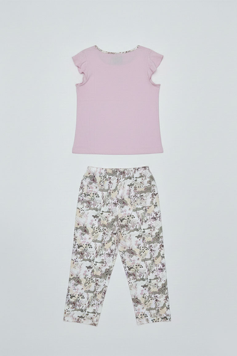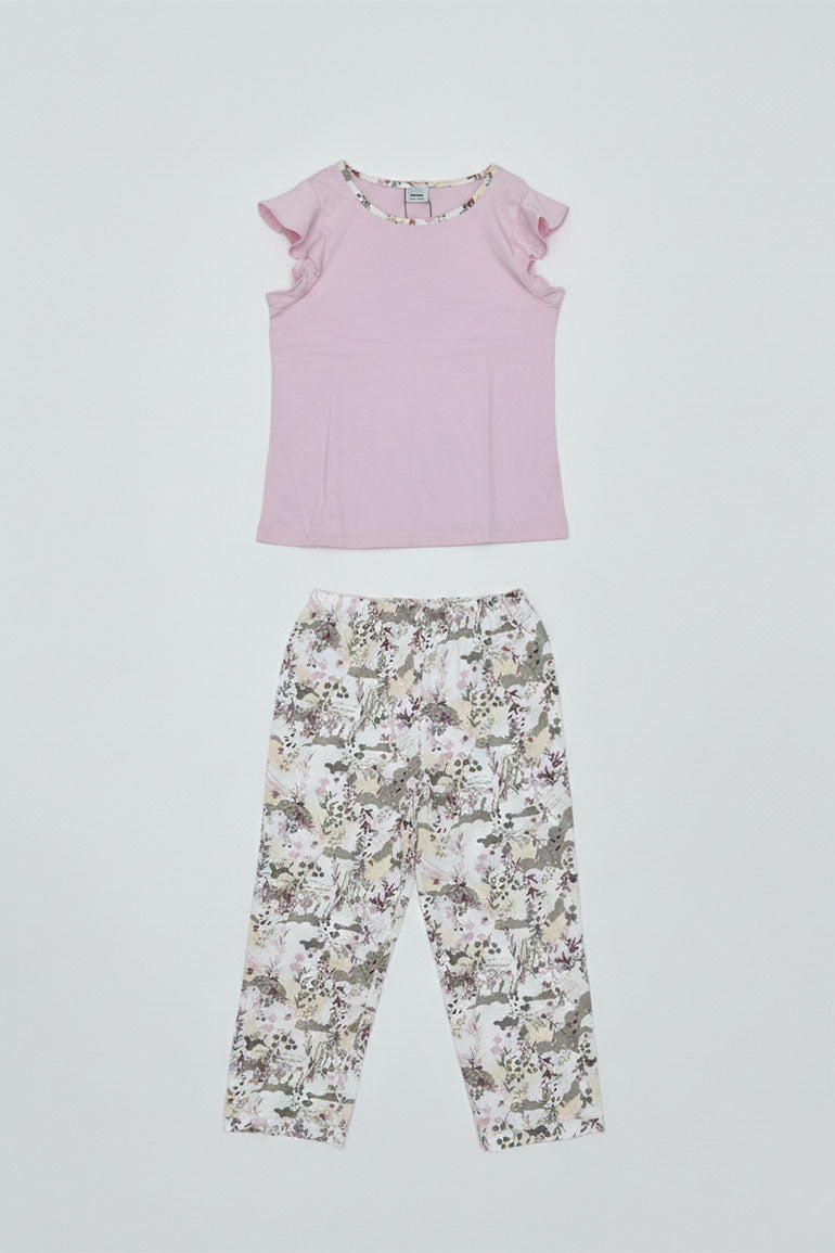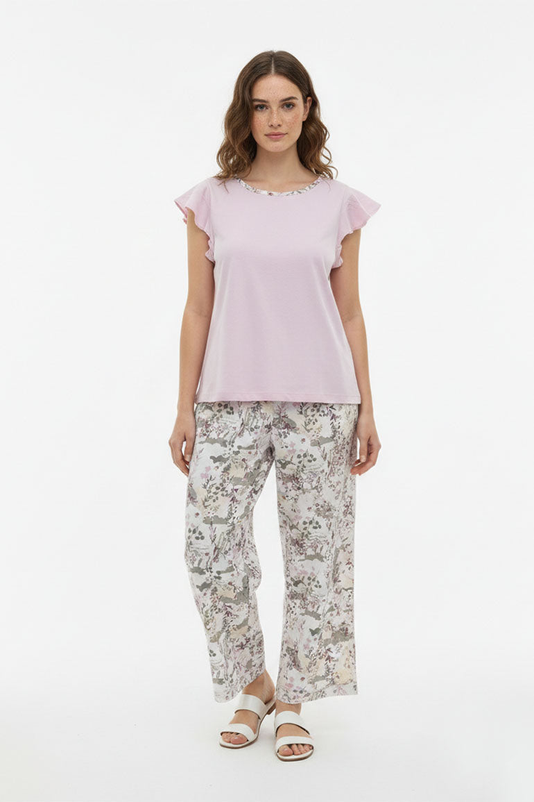A soft and stylish two-piece lounge set featuring a light pink top with delicate sleeve detailing and matching floral print bottoms. Designed for all-day comfort and an easy, relaxed fit. Perfect for lounging at home or casual everyday wear.