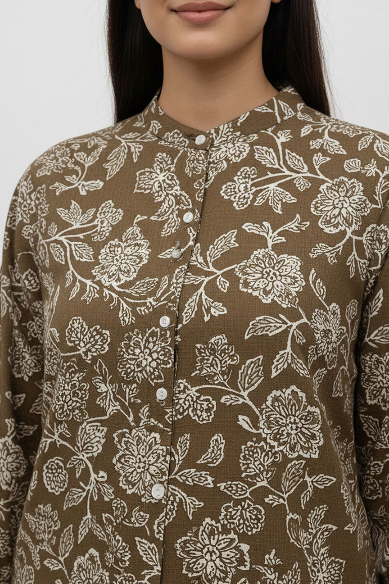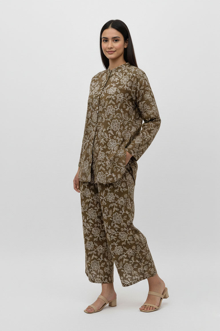 Elevate your everyday style with this elegant brown floral co-ord set for women. Featuring a relaxed-fit button-down top and matching wide-leg trousers, it offers all-day comfort with a chic, coordinated look. Perfect for casual outings, brunch dates, or effortless daywear styling