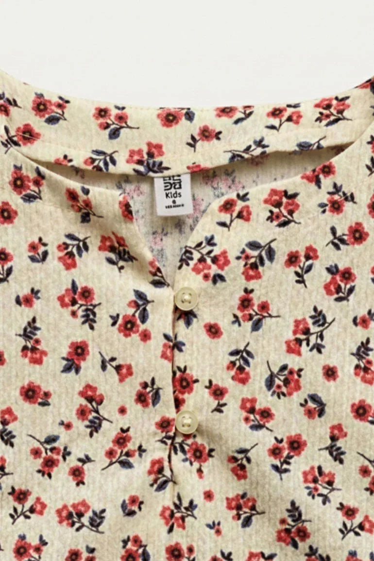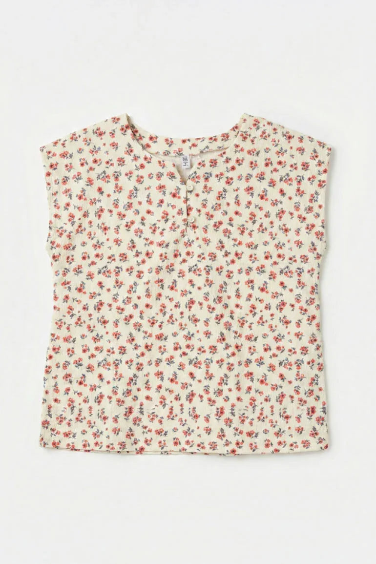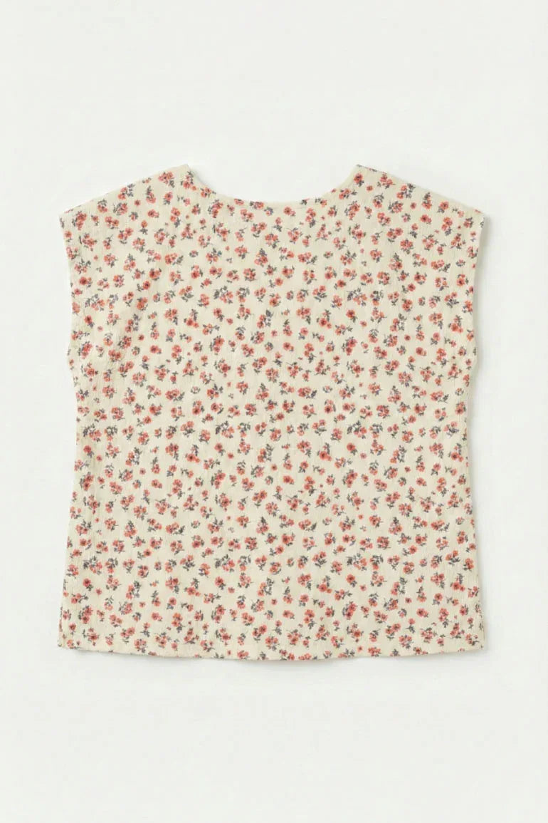 Delicate red sleeveless top adorned with an all-over floral print and a subtle buttoned neckline. Crafted from lightweight, breathable fabric, perfect for warm-weather styling with a soft, feminine touch.