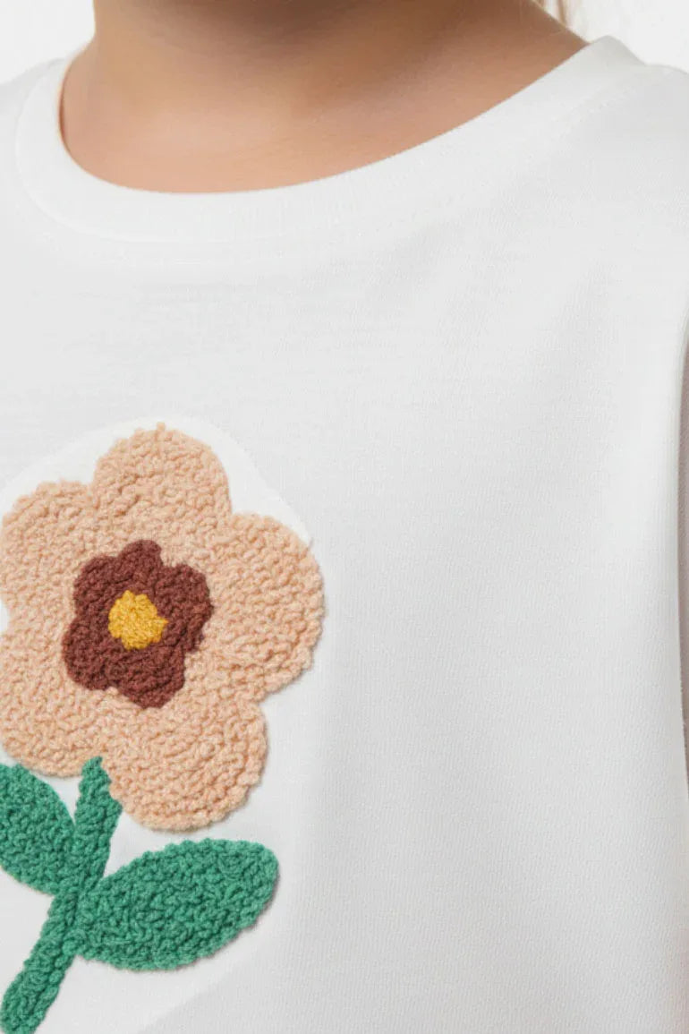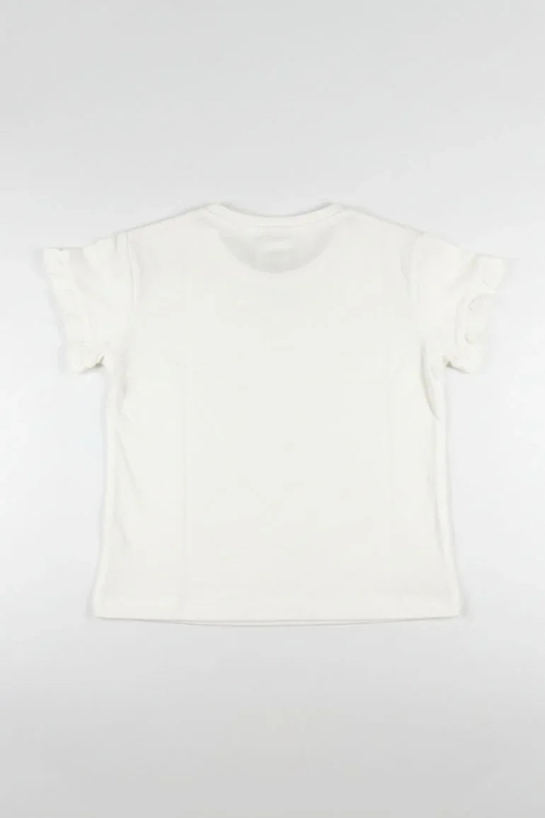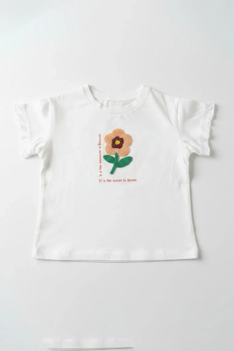Soft buttermilk baby girl top featuring a delicate embroidered flower motif with subtle text detail. Designed with ruffled short sleeves and a comfortable fit for all-day wear. Ideal for casual and summer looks.