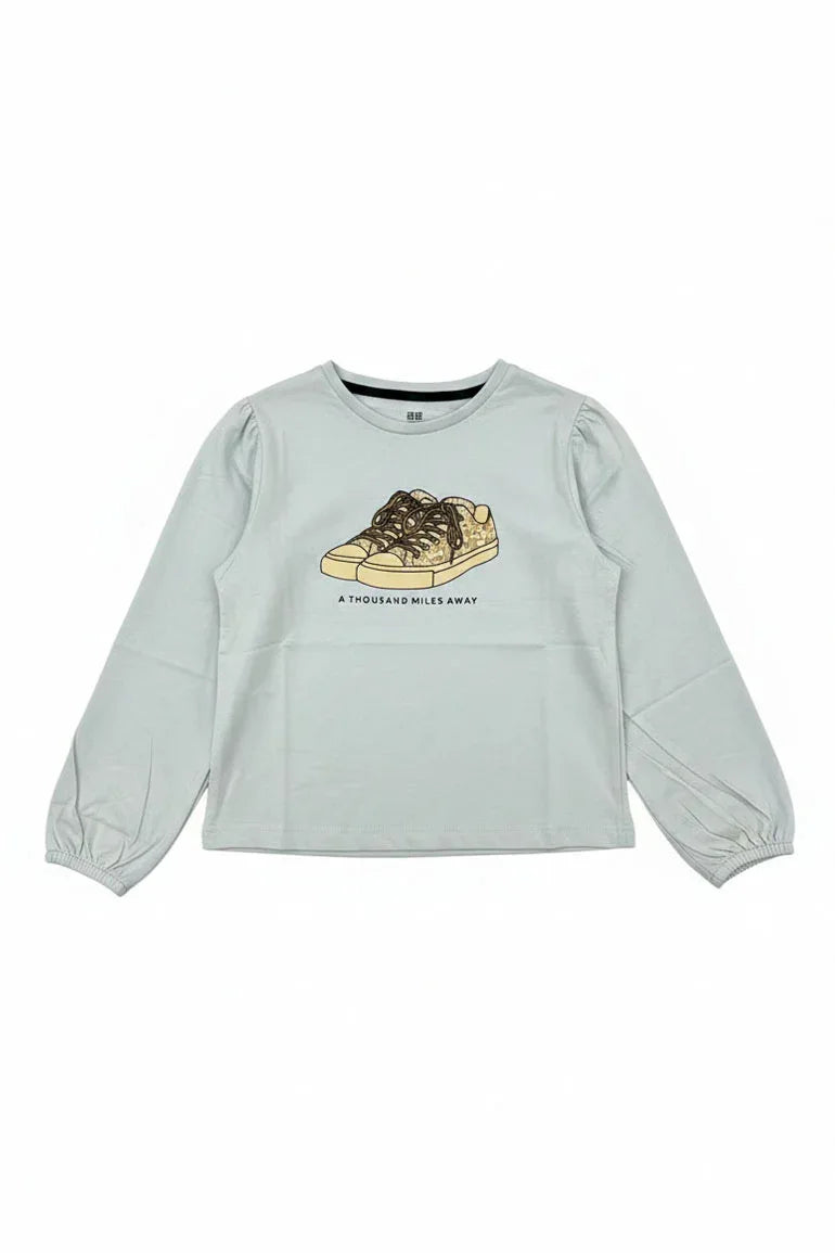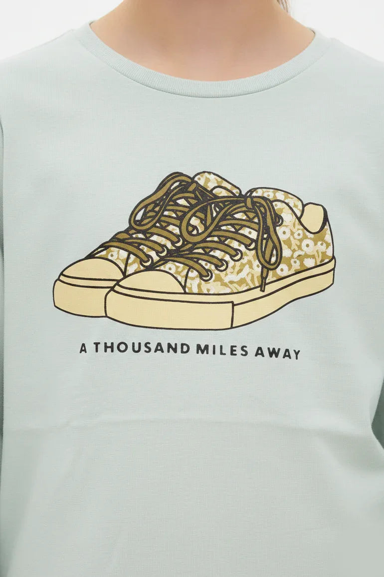 A comfortable long-sleeve T-shirt in a soothing mint green shade, featuring a stylish sneaker graphic on the front. Crafted from soft, breathable fabric with elasticated cuffs, perfect for everyday wear and casual layering.