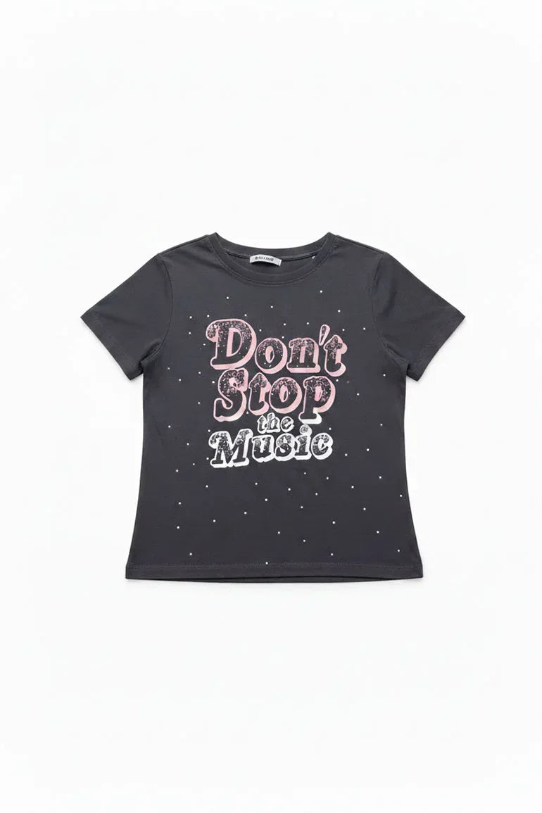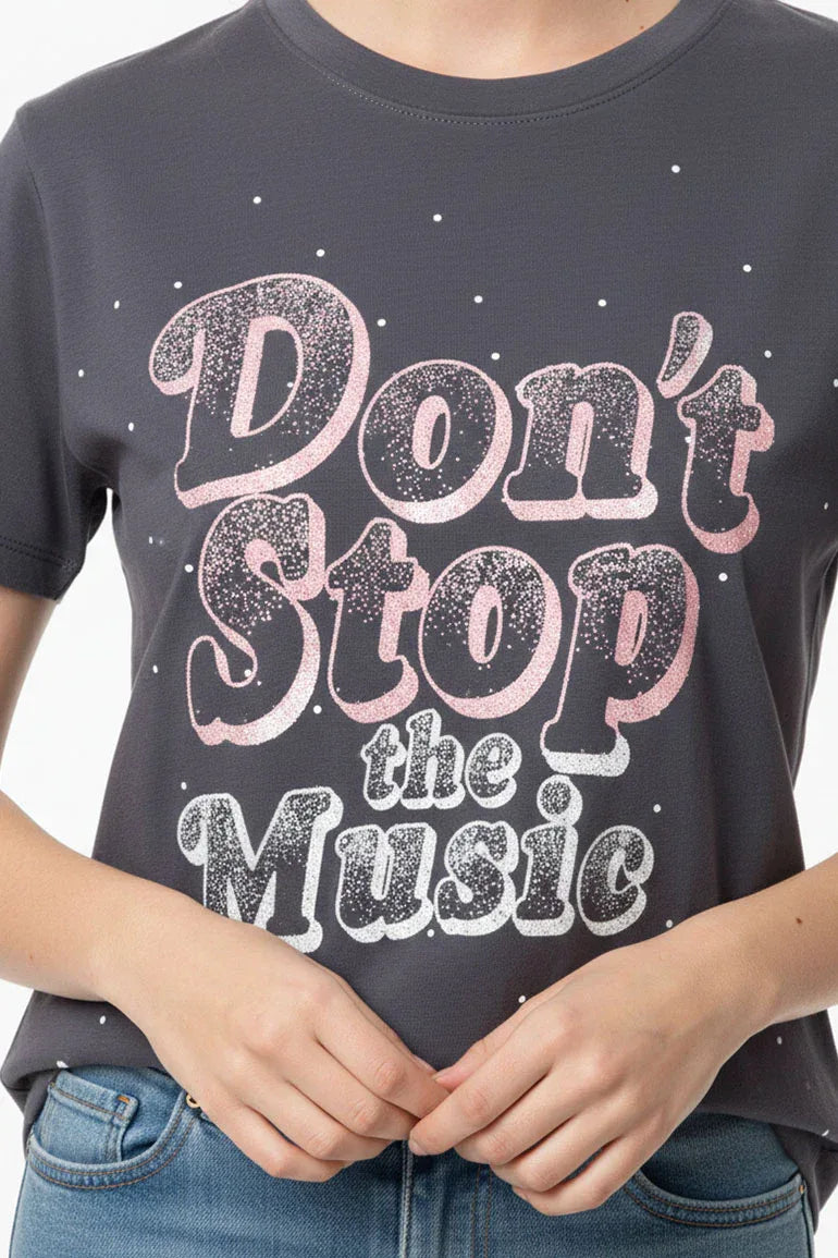 A trendy graphic T-shirt featuring a bold “Don’t Stop the Music†print. Made from soft, breathable fabric with a relaxed fit, perfect for casual wear and everyday styling.