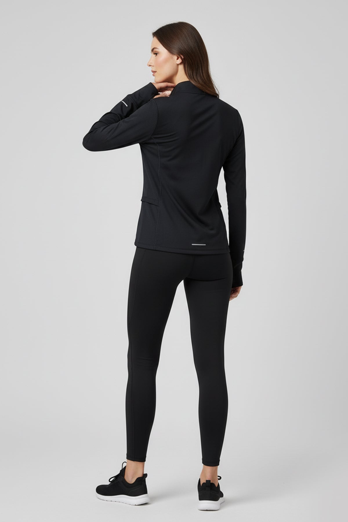 Stay comfortable and confident during your workouts with this women’s charcoal grey half-zip activewear top. Designed with a sleek performance fit and long sleeves, it offers excellent flexibility and breathability. Perfect for both training and casual wear.
