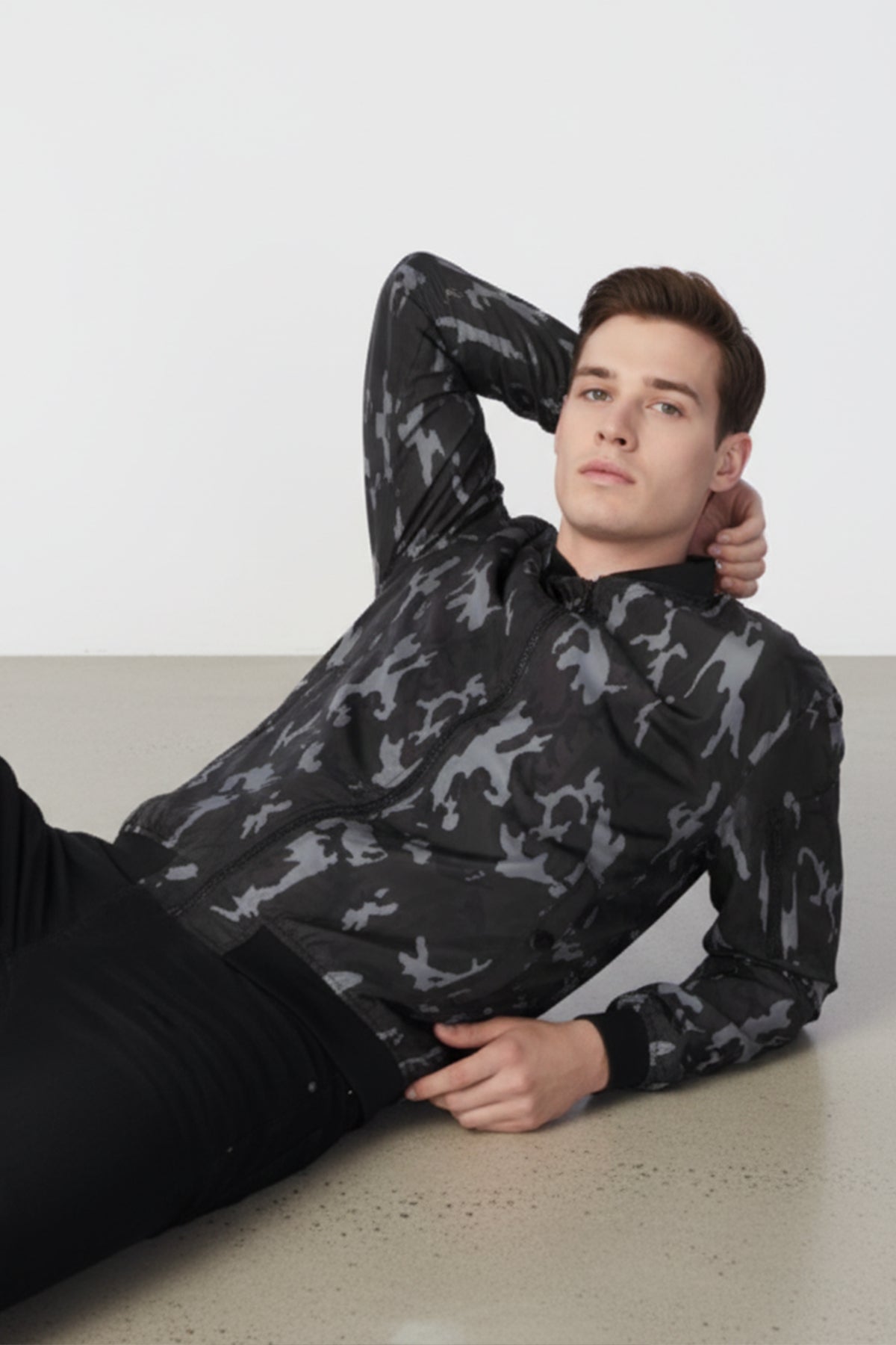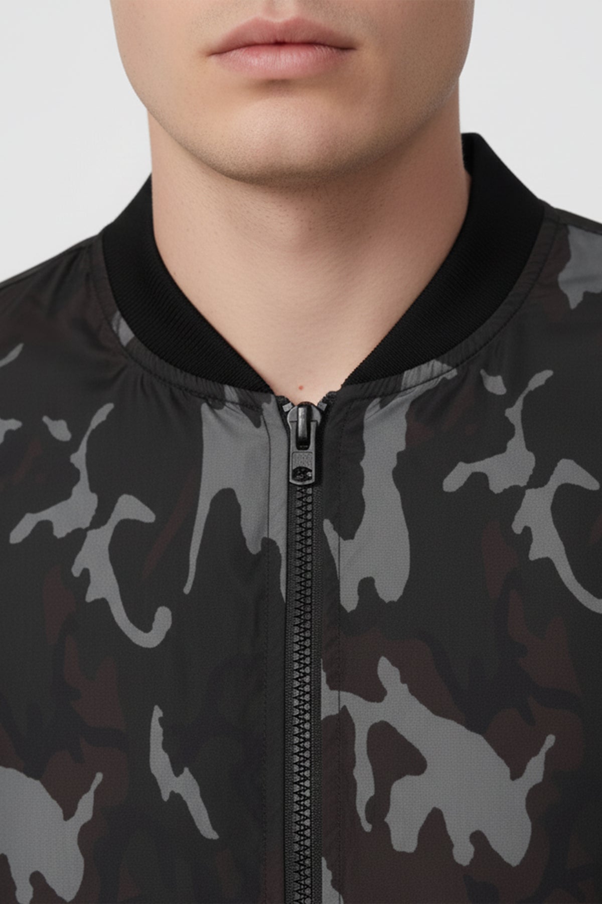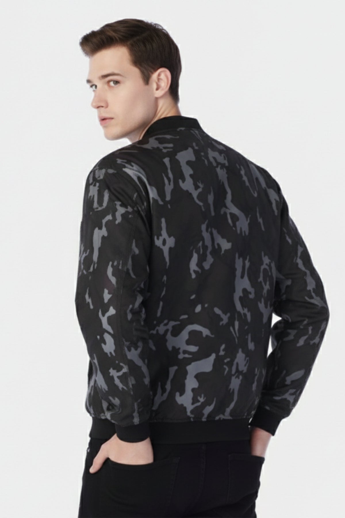100% Nylon Camouflage Bomber Jacket With Front Zipper Closure. Low-Cut Ribbed Collar. Full Sleeves With Single Arm Zipper Pocket. Welt Pockets. Ribbed Cuffs And Hem. Back Yoke