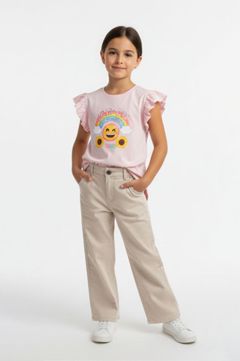 100% Cotton. Stretchable And Comfortable Muted Casual Crew Neck T-Shirt Dress Featuring Short Sleeves With Ruffles. Front Illustration With Typography. Curved Hem
