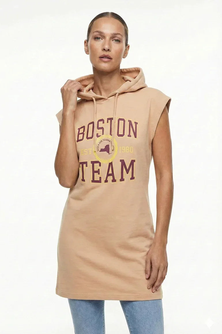 80% Cotton & 20% Polyester. Cozy And Comfortable Muted Front Closed Hoodie Dress With Self Drawstring And Hood. Front Typography.