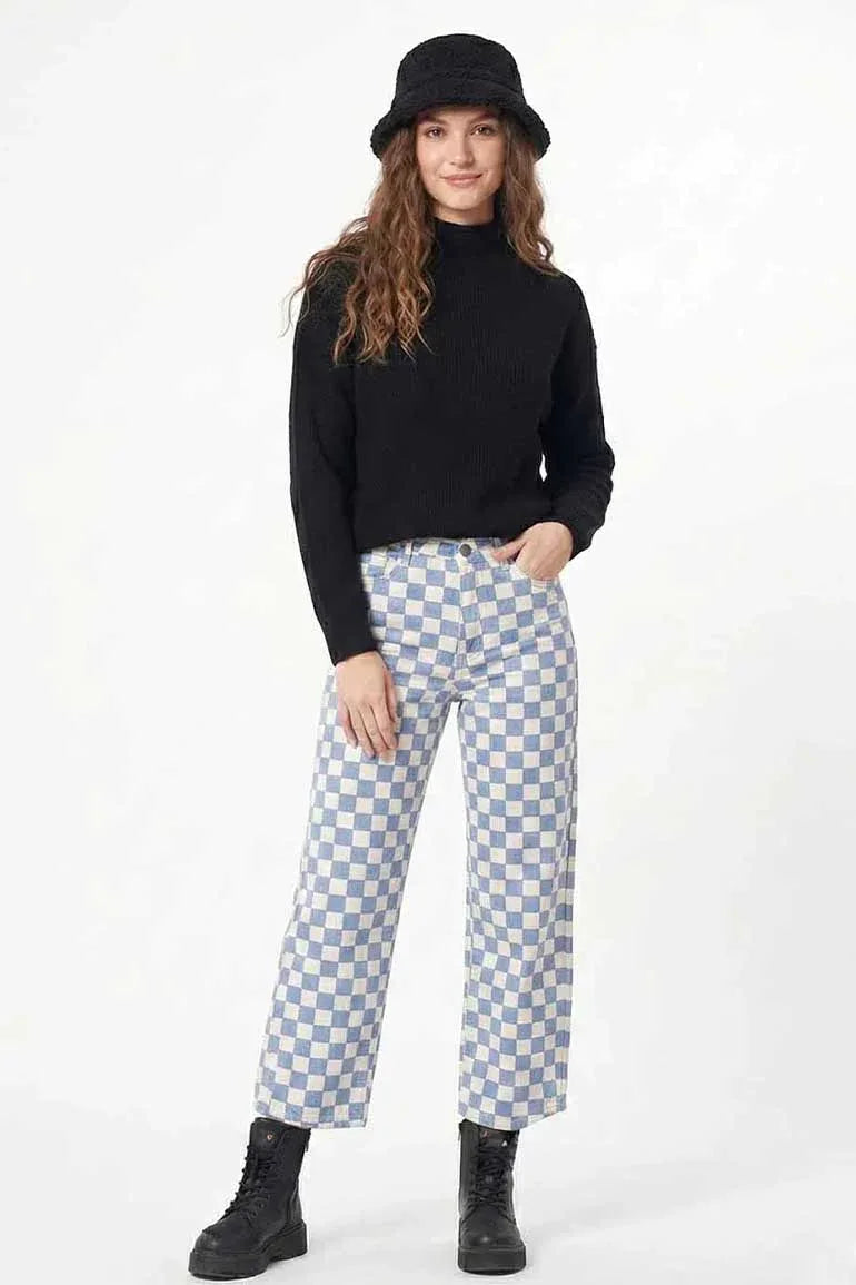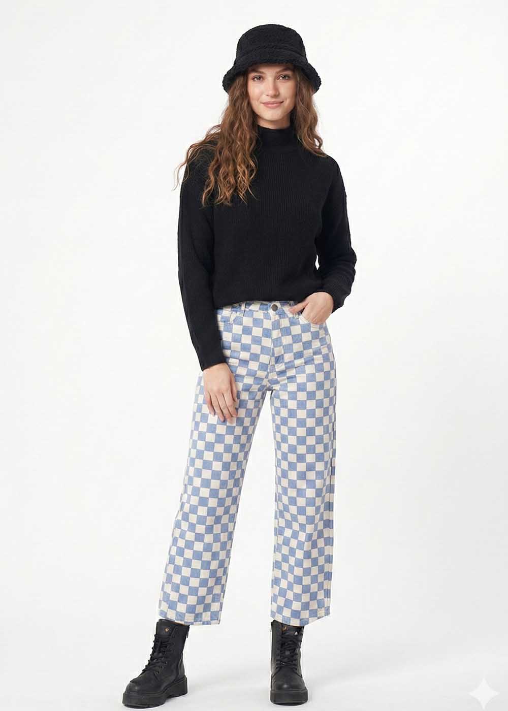 100% Cotton. Classical And Comfortable Checker Board Print Denim Jeans. Regular Waistband With Button And Loops. Front Slash Pockets. Rear Patch Pockets. Straight Hem