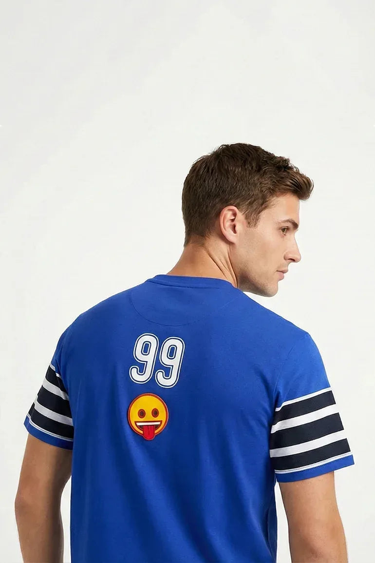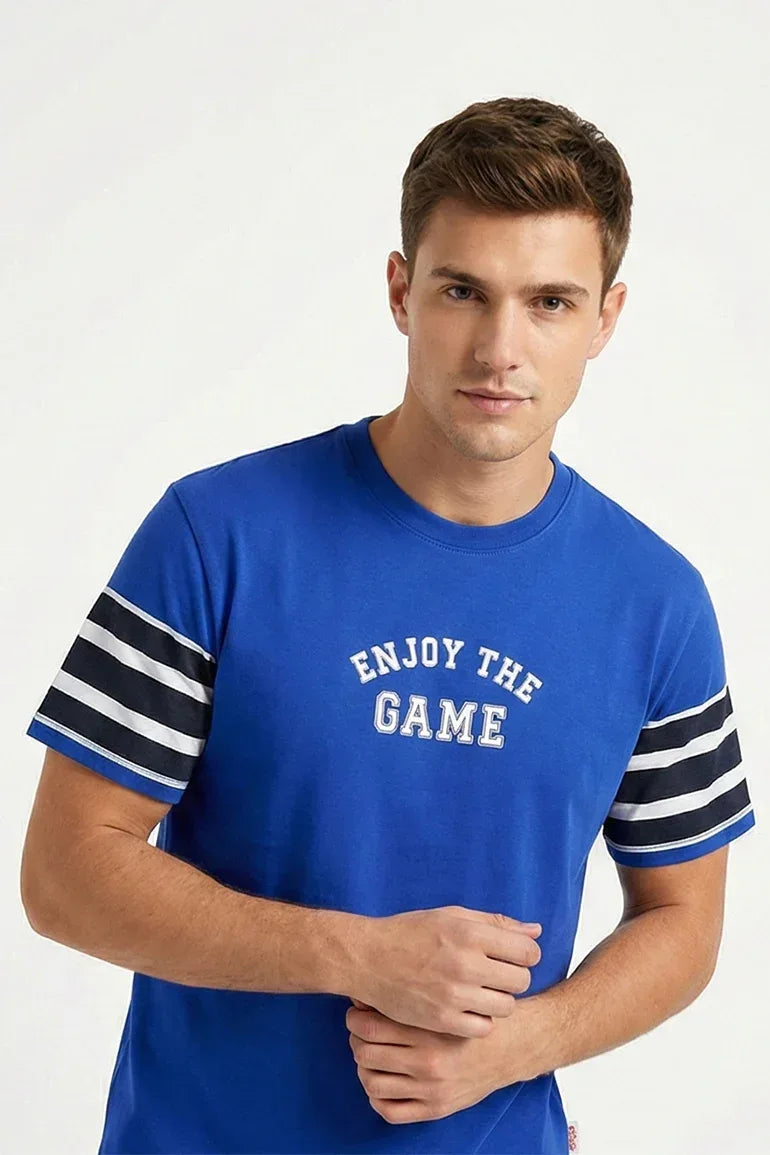 100% Cotton. Casual And Comfortable Vibant Ribbed Crew Neck T-Shirt Featuring Colorblock Short Sleeves. Front And Rear Typography