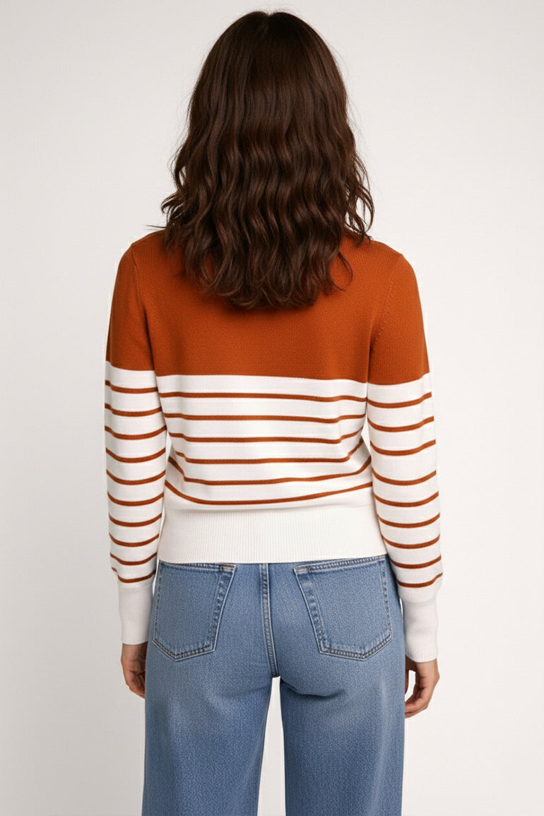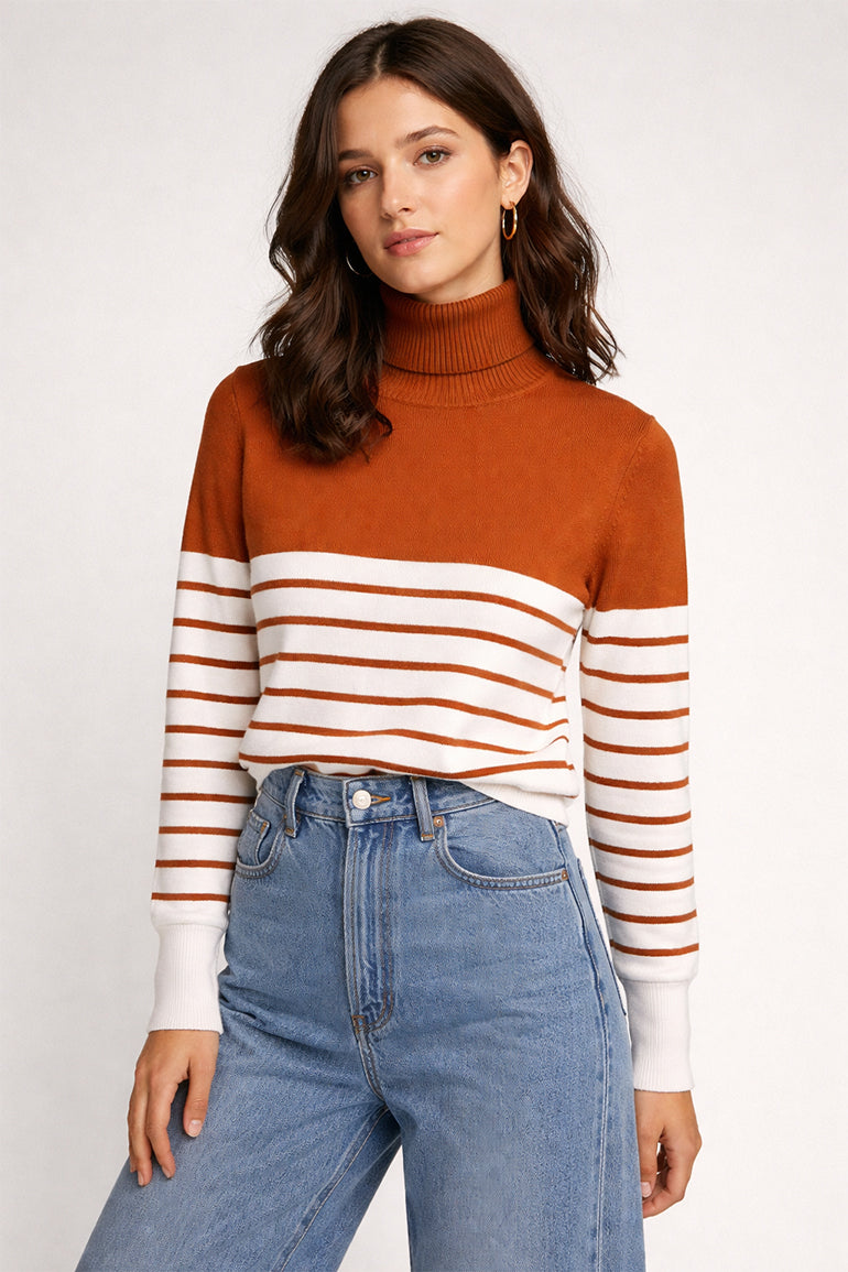 | Smart pullover sweater with turtle neck, long sleeves and stripes. |