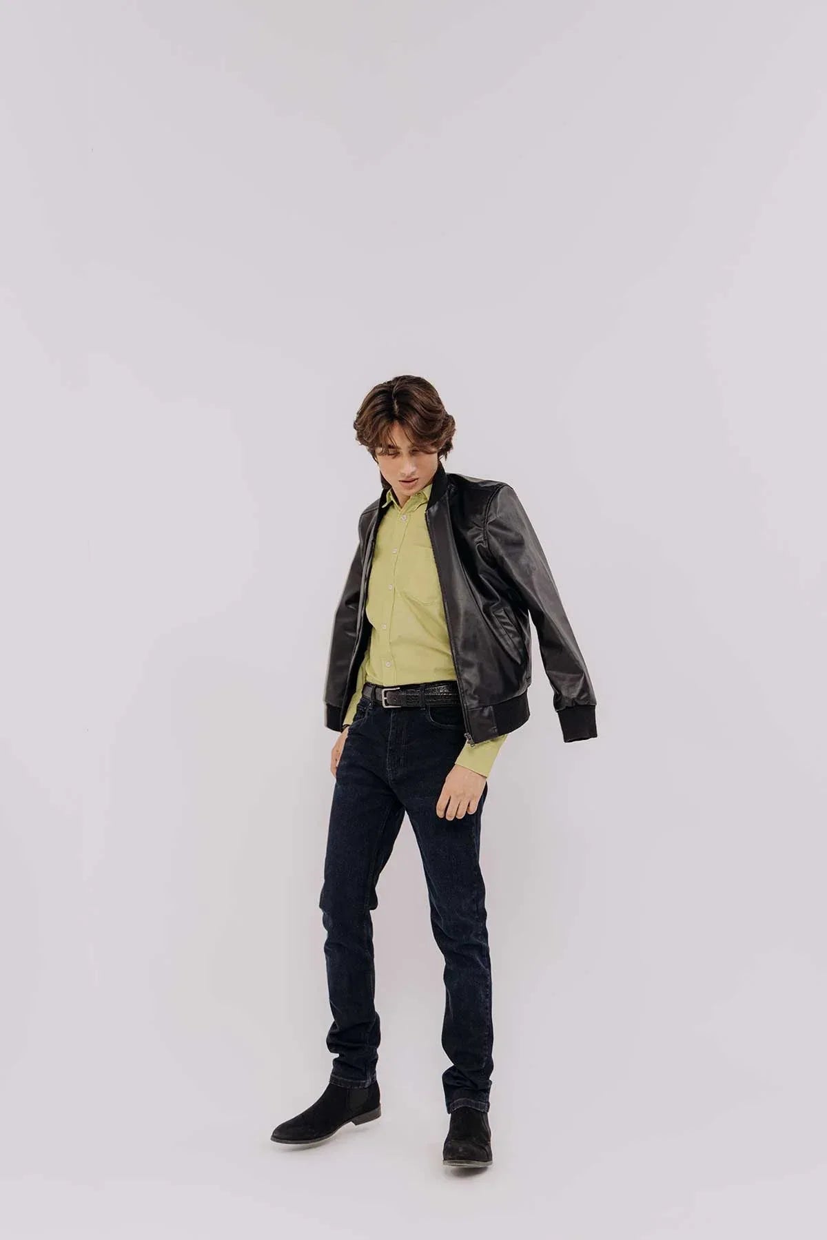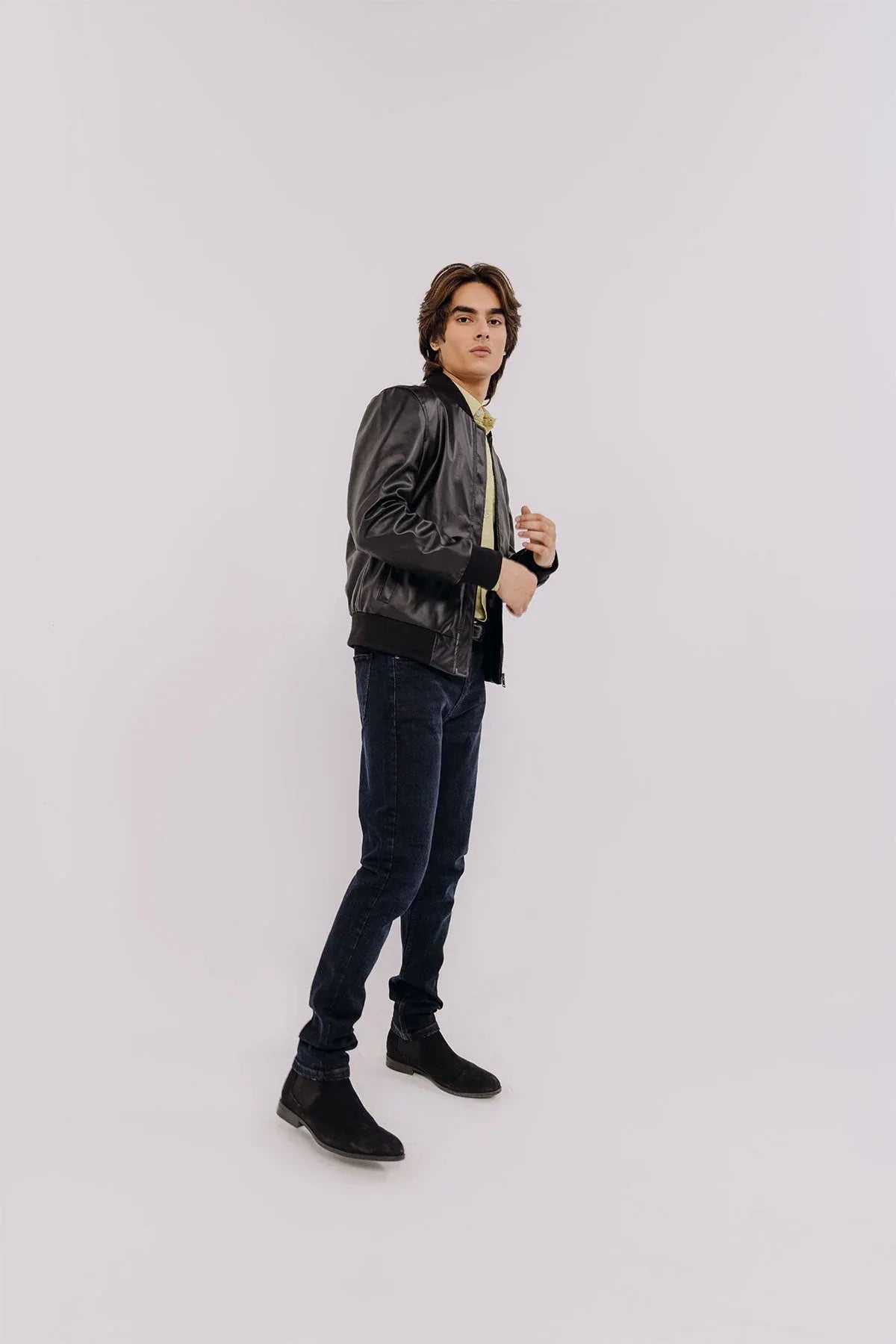 100% Polyester. Classic Leather Bomber Jacket With Ribbed Collar, Cuff And Hem Along With Front Zip Up. Featuring Side Welt Pockets.