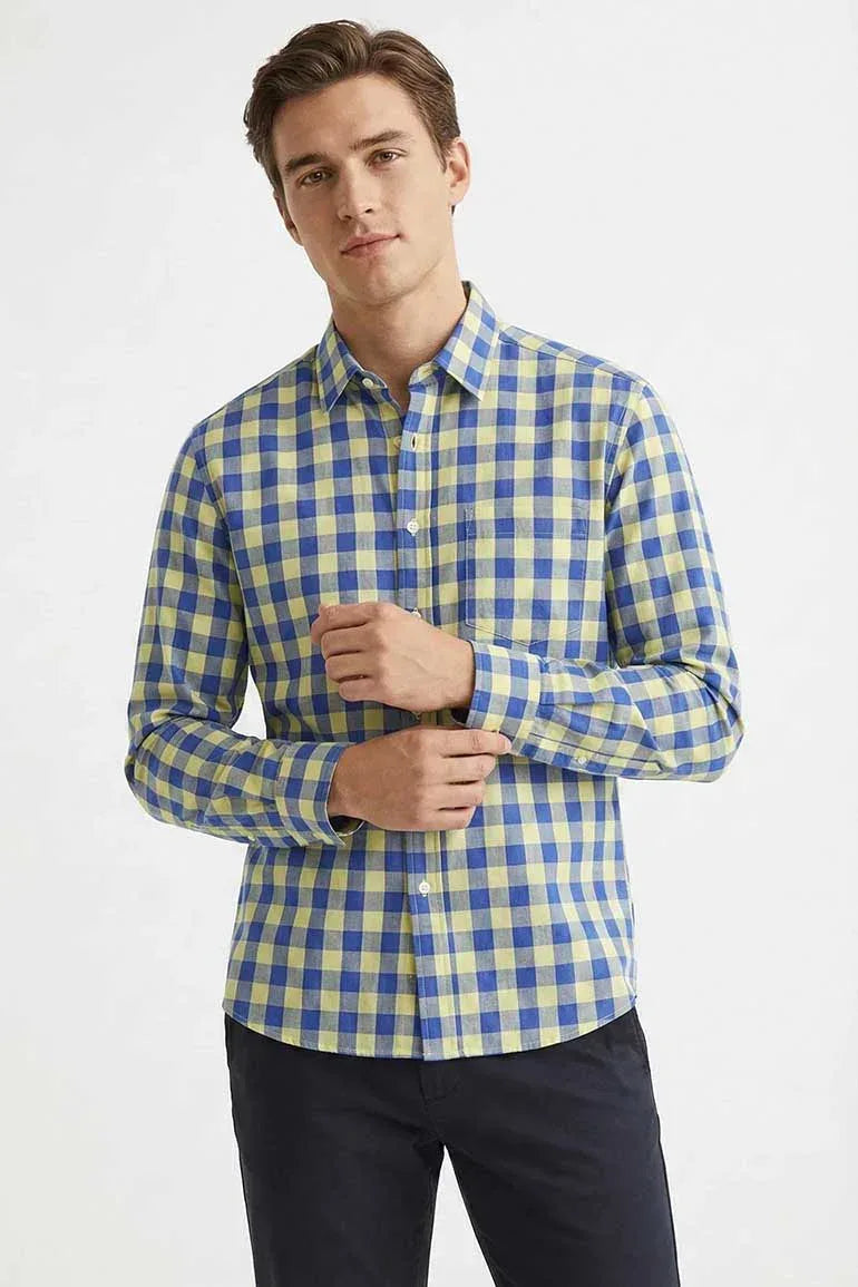 Poly Cotton. 65% Cotton 35% Polyester. Regular Fit. Checkered Button Down. Regular Collar. Long Cuffed Sleeves. Front Patch Pocket.
