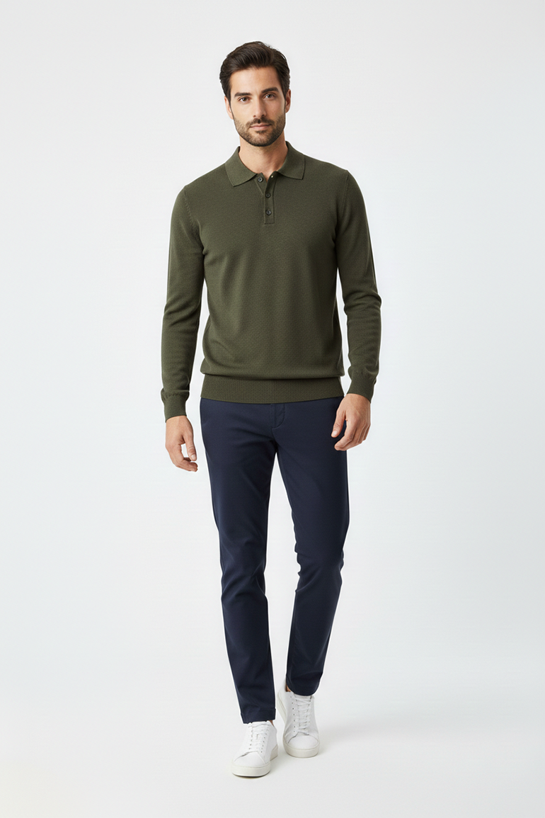 Pair this polo sweater with dark jeans or chinos for a polished, casual look, or style it with tailored trousers for a more refined, smart-casual vibe.