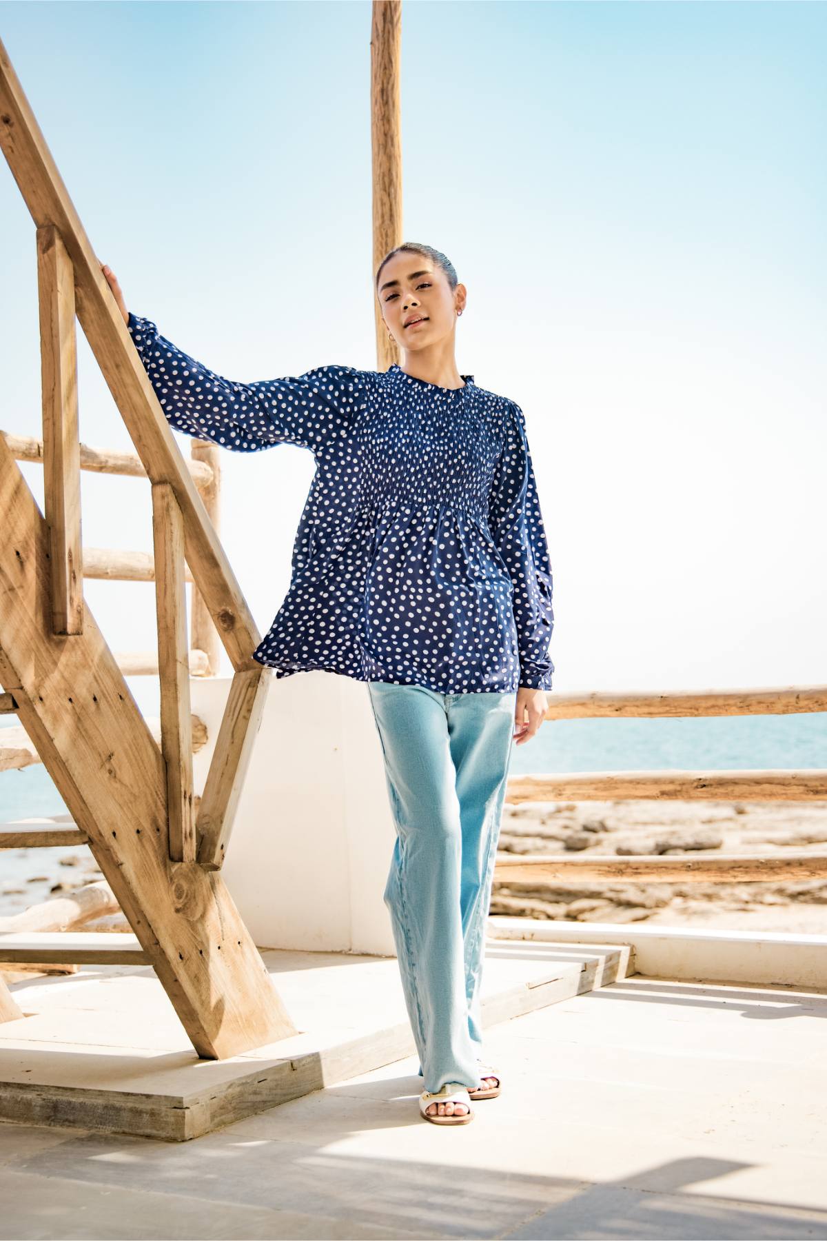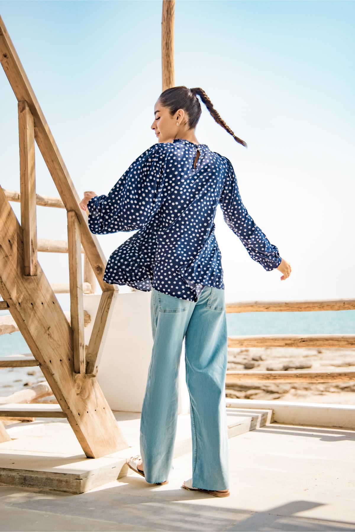 100% viscose. moss crepe flowy polka dot blouse with band collar featuring ruching shoulder. long sleeves with cinched hem. rear shoulder ruching. flounce hem