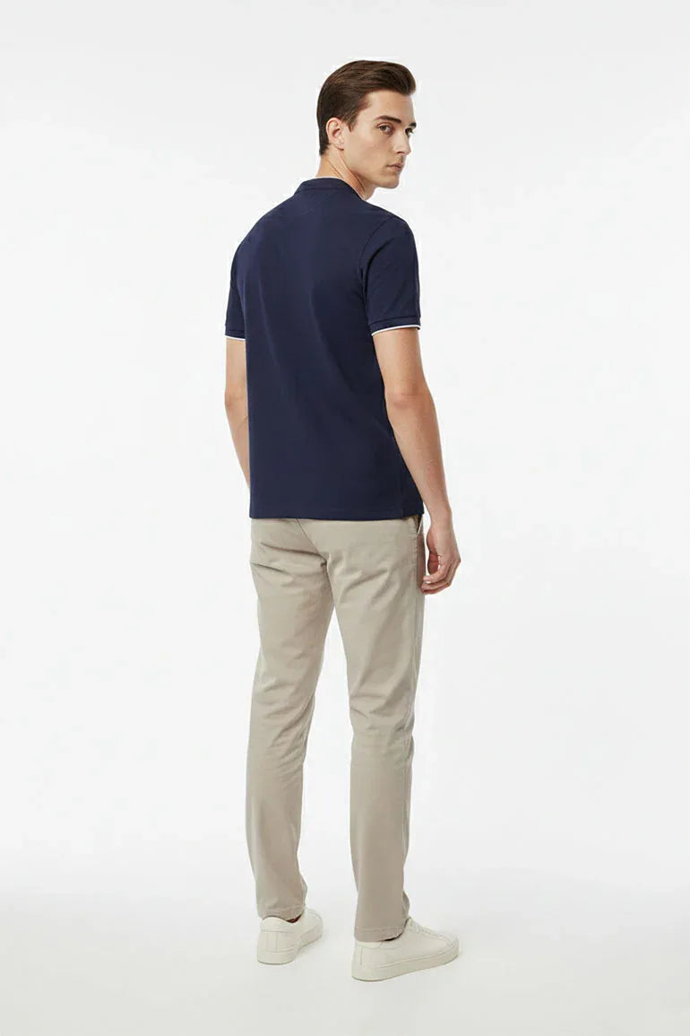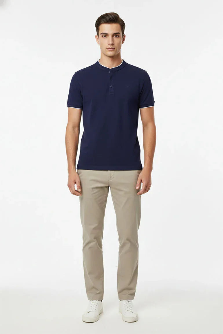 Classic men's striped polo in 100% cotton. Features a henly collar, front button placket, and short sleeves ideal for casual comfort and style.