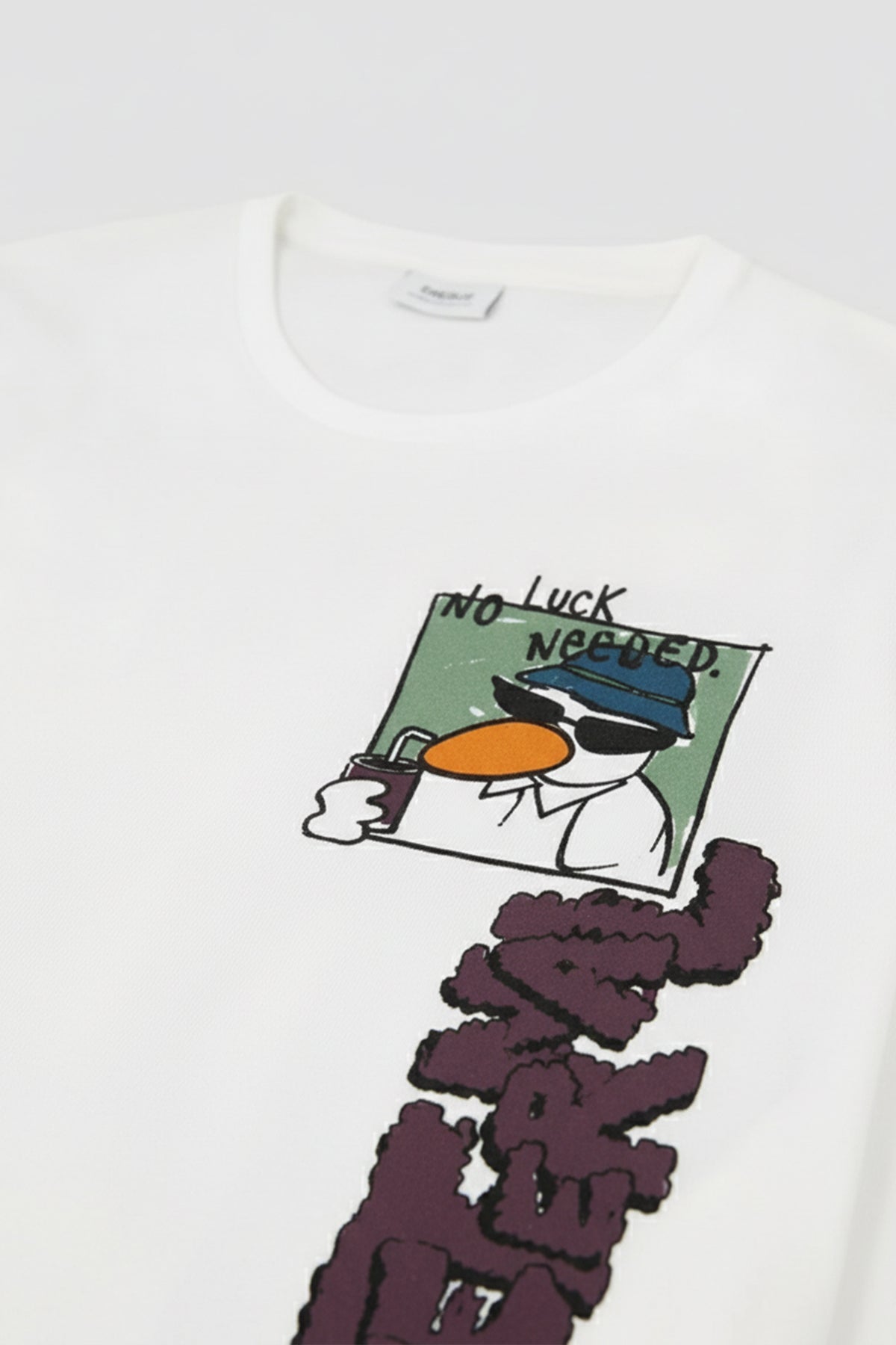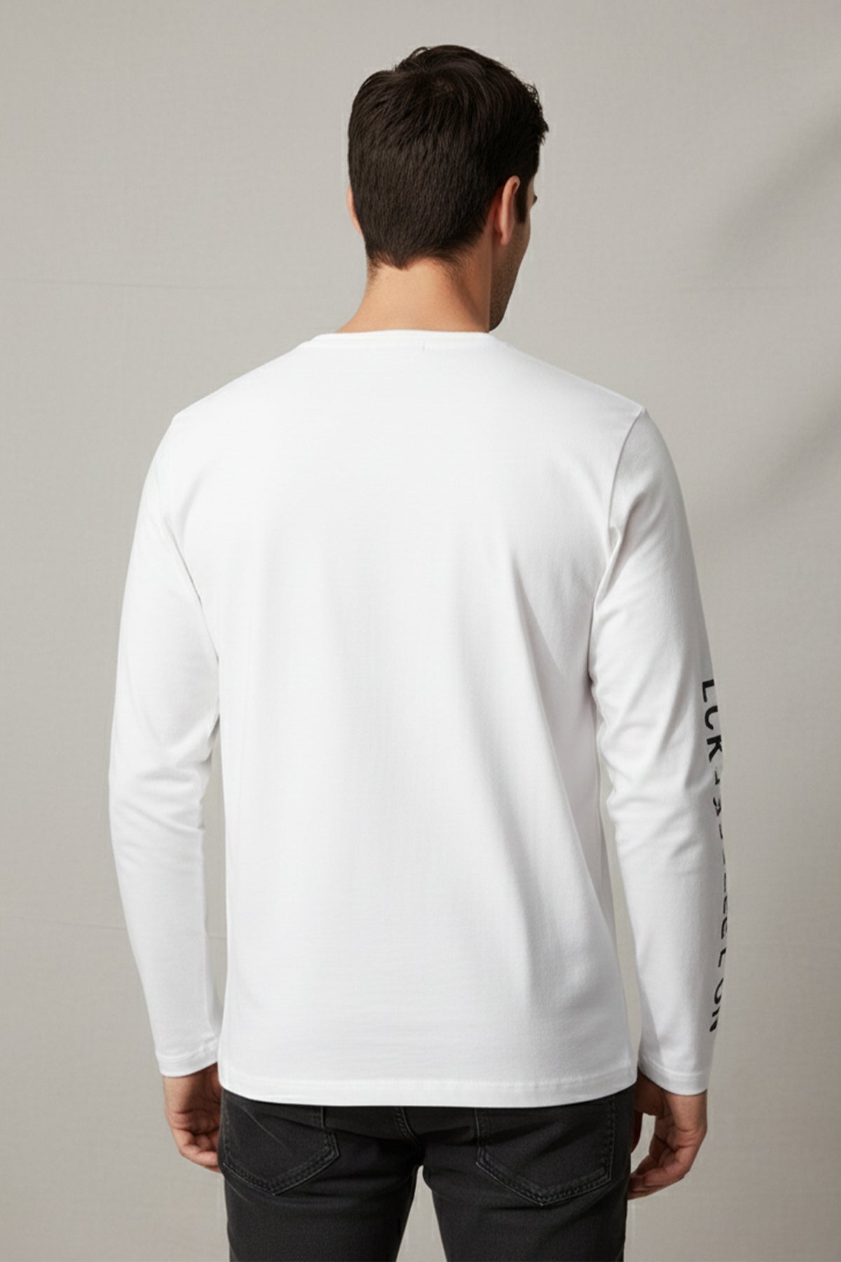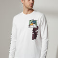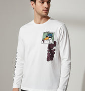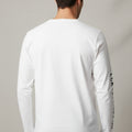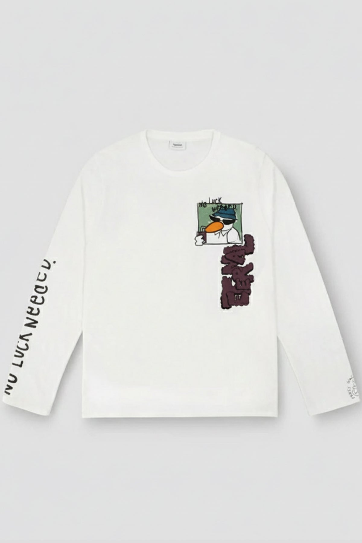 100% Cotton. Casual And Comfortable Neutral Ribbed Crew Neck T-Shirt Featuring Long Sleeves With Typography. Front Illustration And Typography