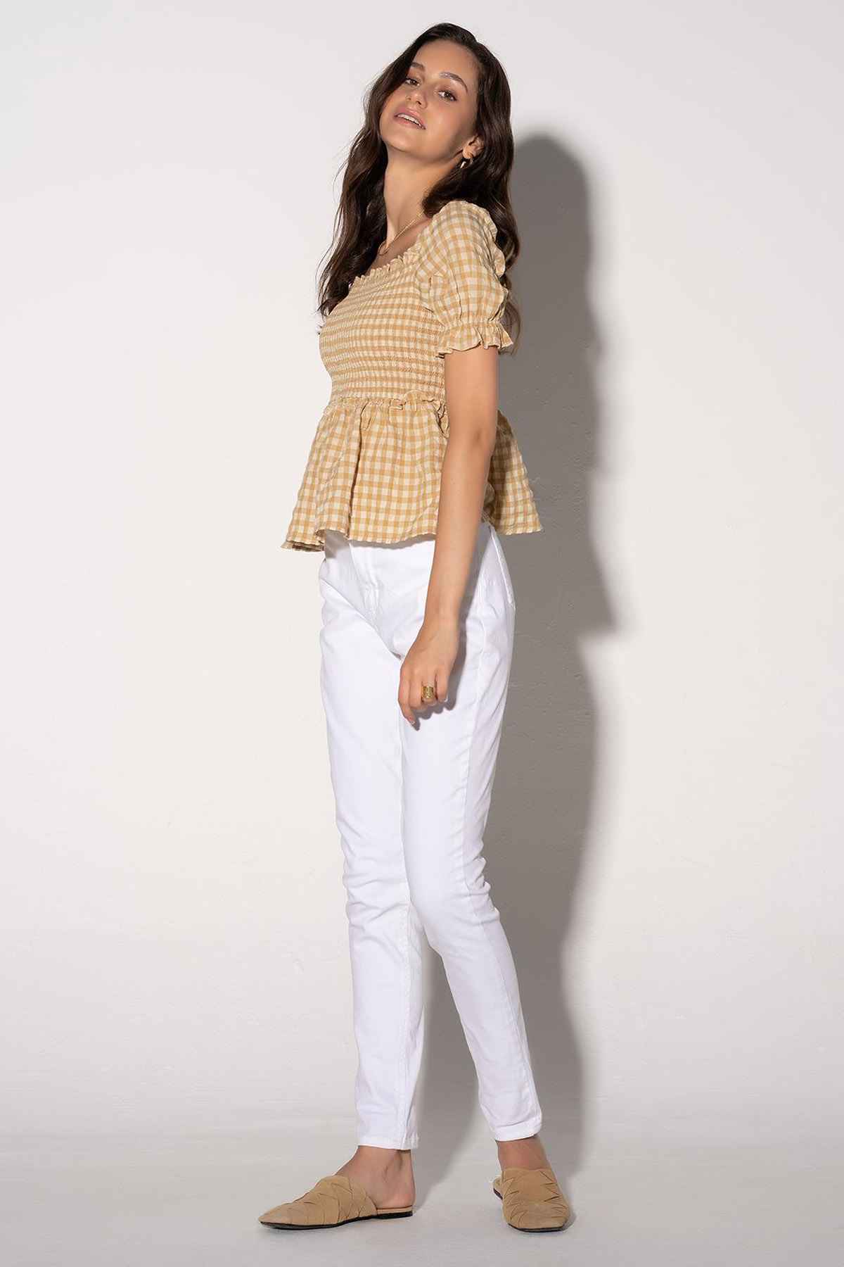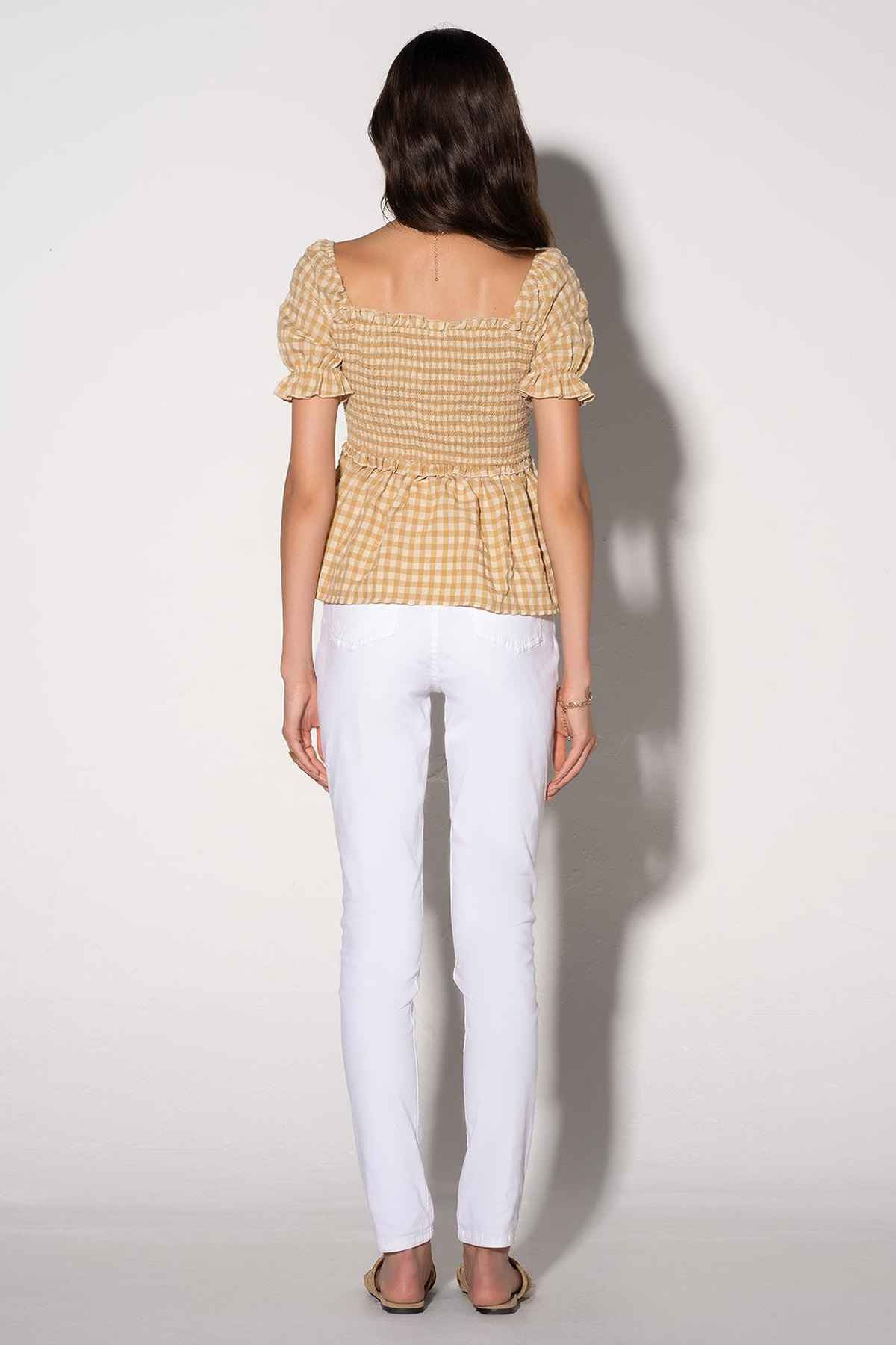 100% Polyester. Classical Checkered Peplum Top With Florentine Neckline Featuring Ruffles. Gathered Short Puff Sleeves. Bust Shirring. Flounced Hem