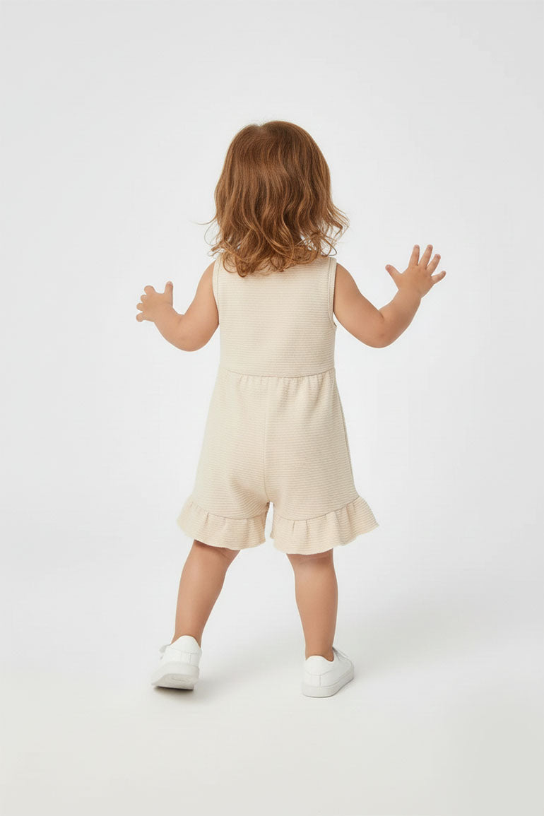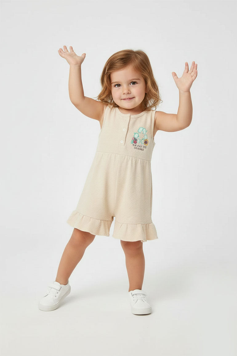 100% COTTON. SOLID INTERLOCK MUTED SLEEVELESS JUMPSUIT FEATURING RIBBED HENLEY NECK. CHEST EMBROIDERY. WIDE RUFFLED HEM