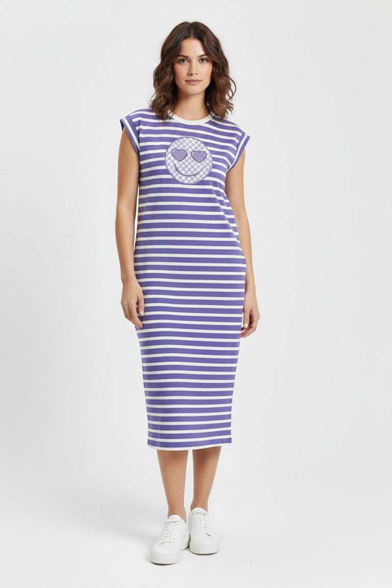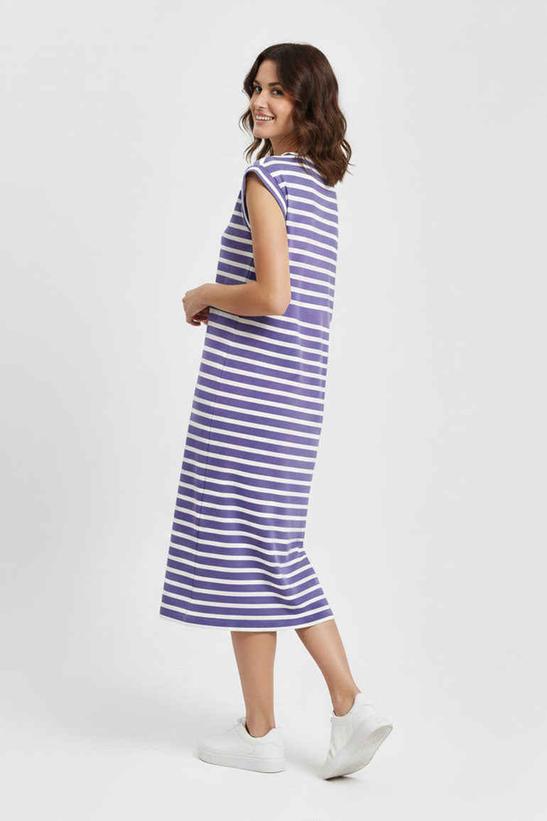 100% Cotton. Trendy And Comfortable Vibrant Single Jersey Striped Print Long Dress Featuring Bias Trimmed Crew Neck With Cap Sleeves. Front Illustration.