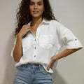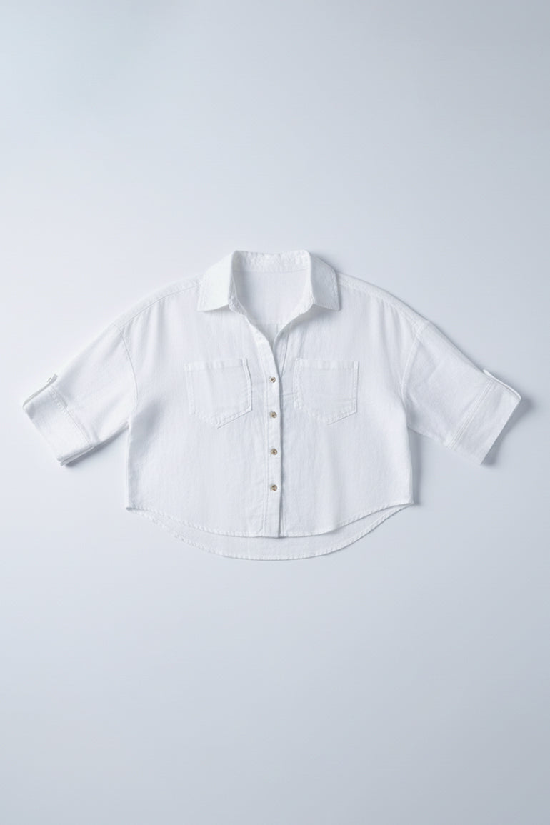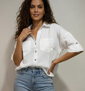 Stay effortlessly cool with this oversized shirt for women. Designed for relaxed comfort, it features a button-down front, double flap pockets, and roll-tab sleeves for versatile styling. The breathable linen fabric ensures a lightweight, airy feel — perfect for casual days, travel, or layering over a tank top for an easygoing, chic look.