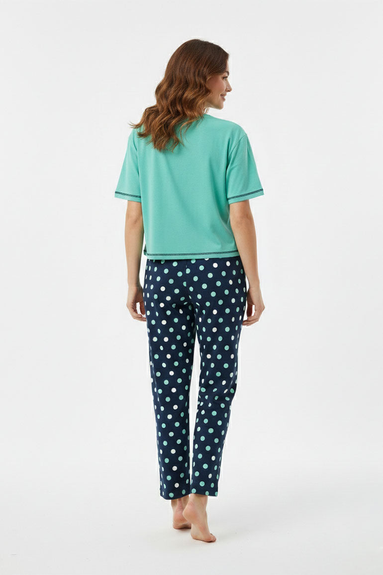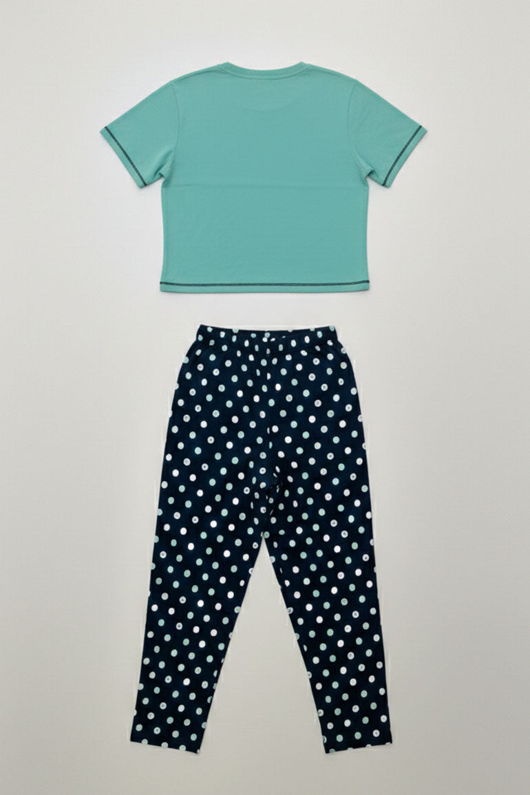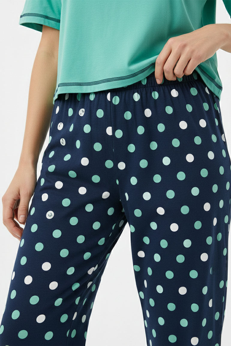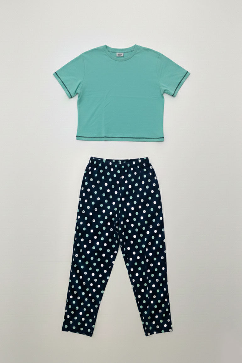 A stylish two-piece set featuring a cropped green tee with contrast stitching and printed blue polka dot lounge pants Designed for relaxed comfort with a playful vibe, perfect for casual days or laid-back weekends.