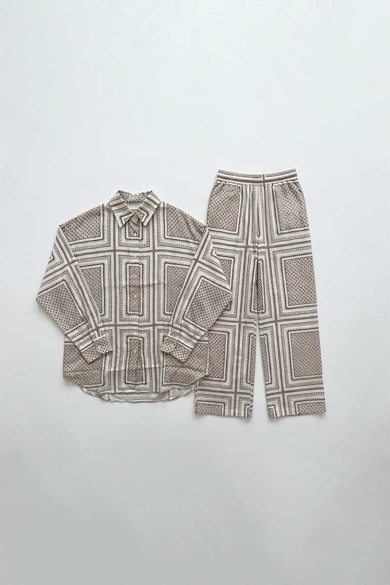 A stylish printed co ord set with a relaxed shirt and flowing wide leg pants