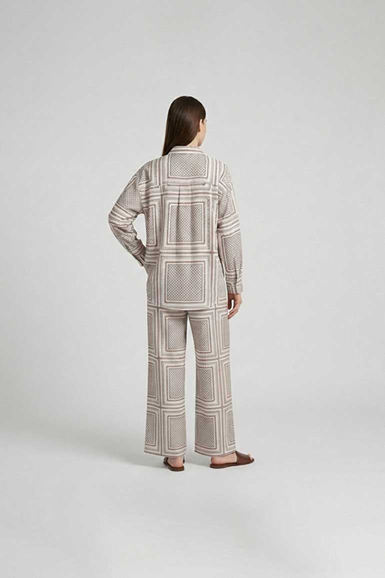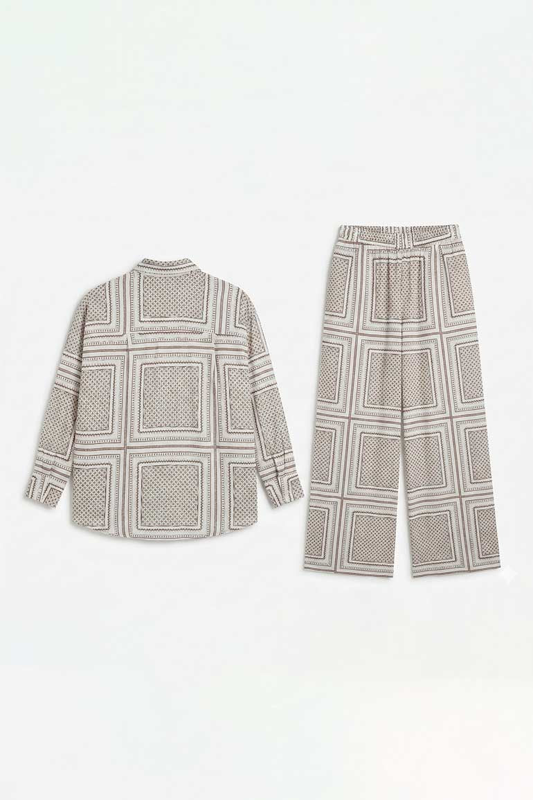 Printed Shirt And Wide Leg Pants Set For Women - Ecru