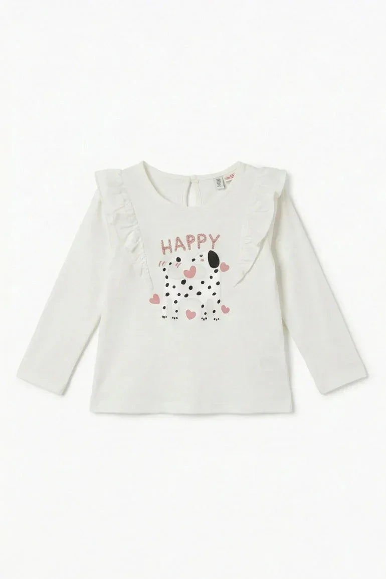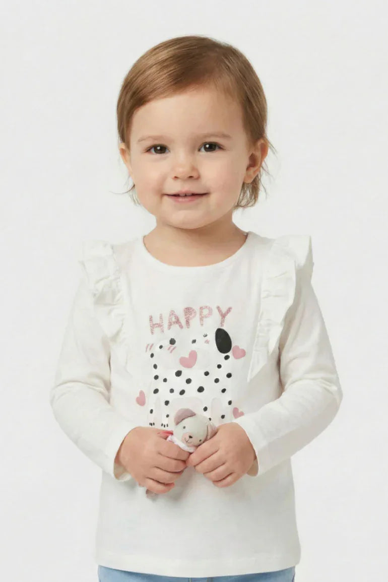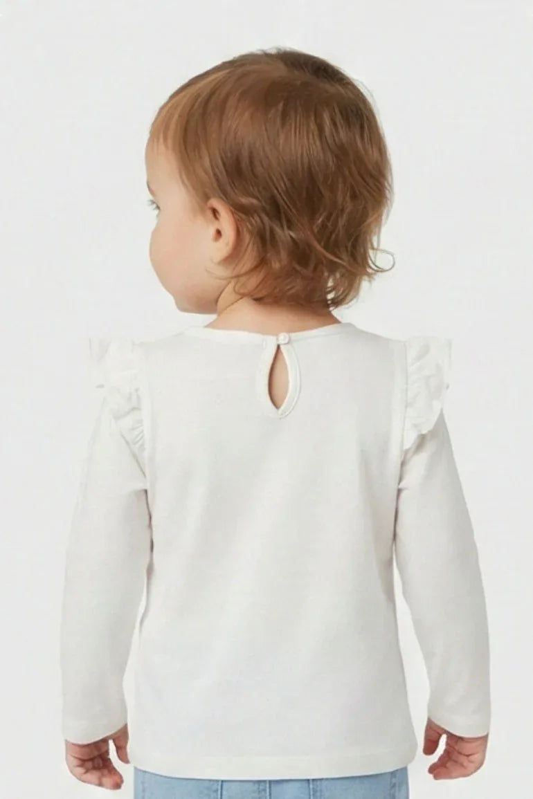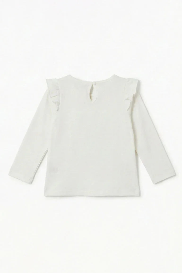 Soft long-sleeve T-shirt featuring a cute printed graphic and delicate shoulder frill detailing. Designed for everyday comfort with an easy fit, perfect for baby girl casual wear.
