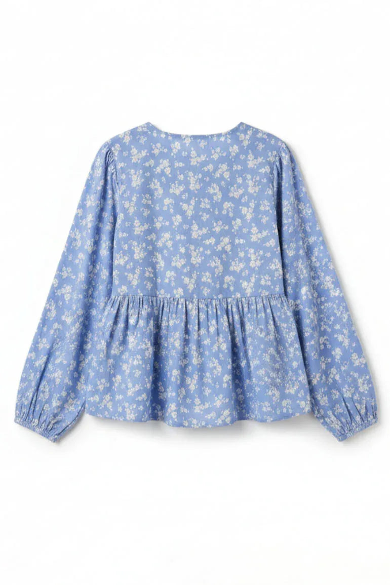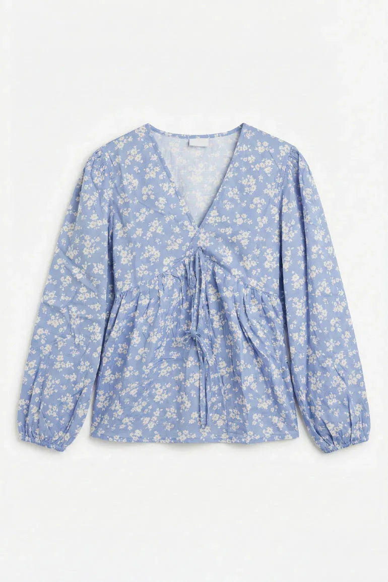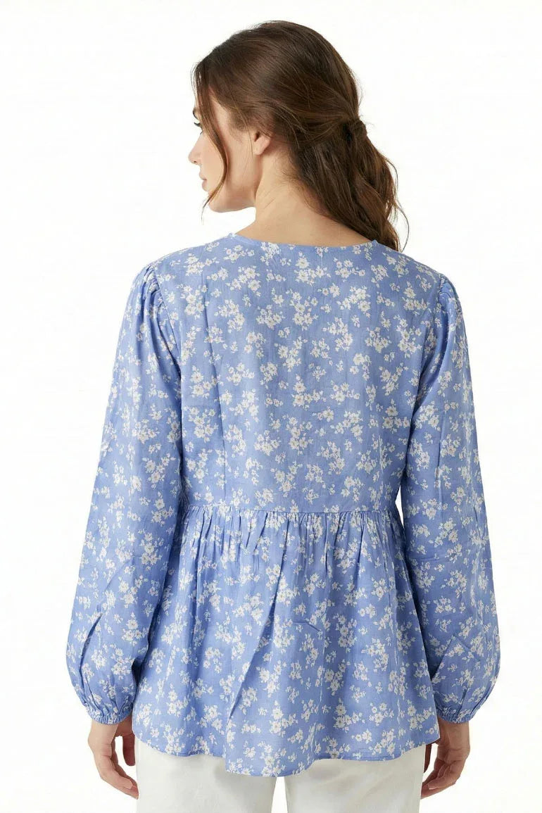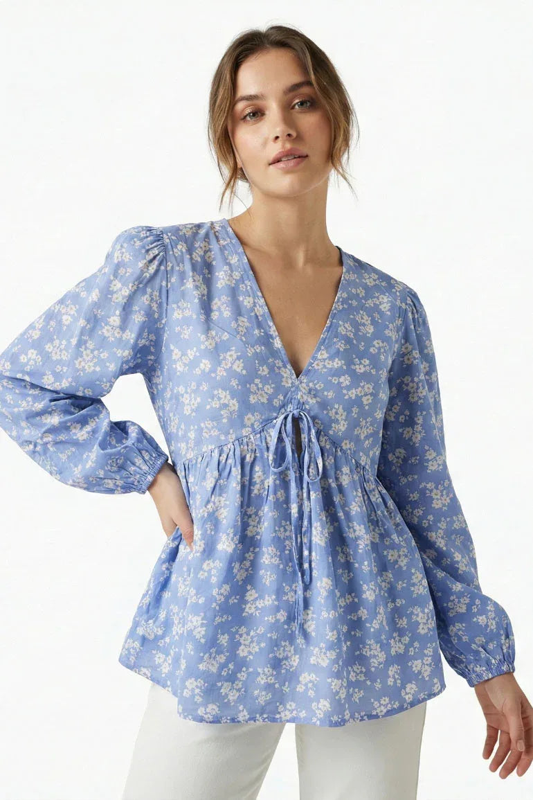 Serenity blue printed V-neck top designed with a soft floral pattern, gathered waist, and adjustable front tie detail. Finished with full sleeves and a relaxed silhouette, offering a feminine and effortless everyday look.