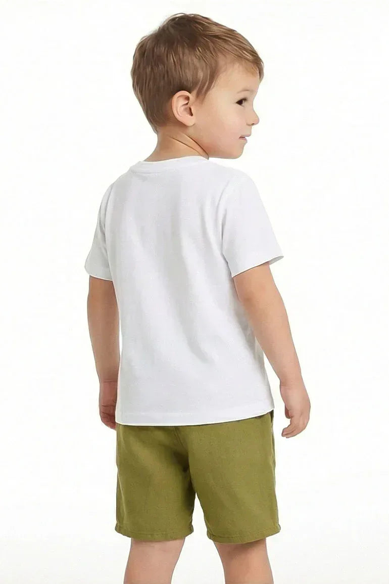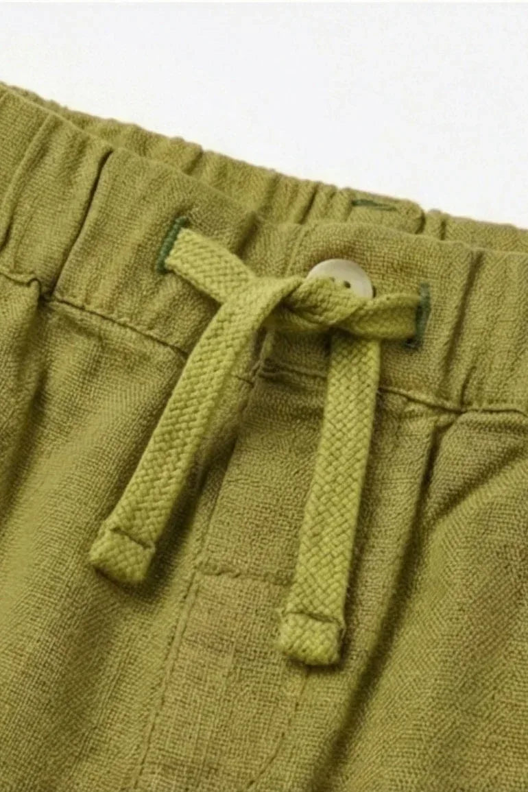 These casual drawstring shorts are crafted from soft, breathable fabric for all-day comfort and easy movement. Featuring an elasticated waistband with adjustable ties in a stylish olive green shade, they’re perfect for playtime, summer outings, or everyday wear.