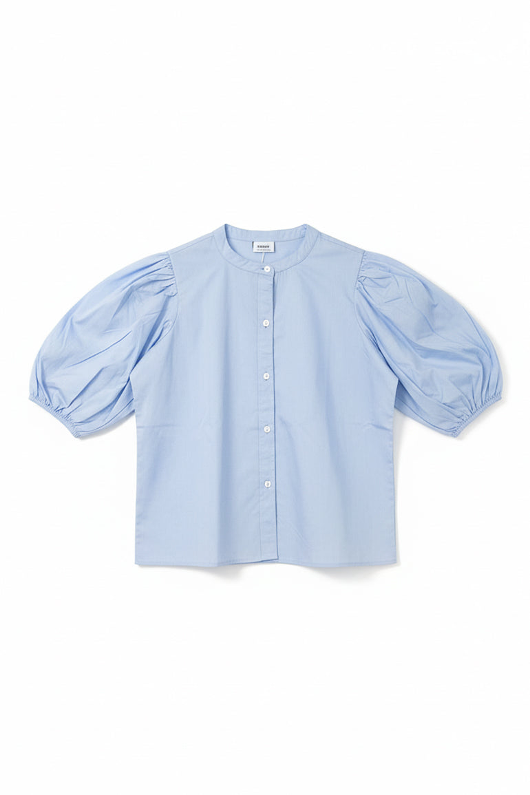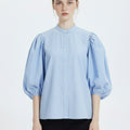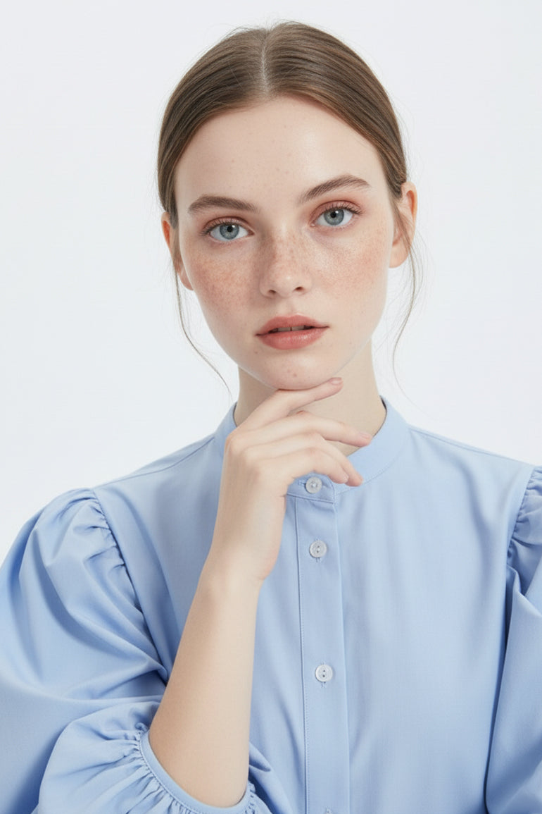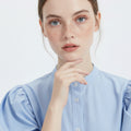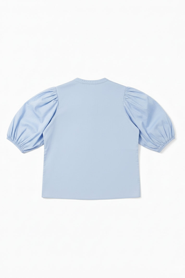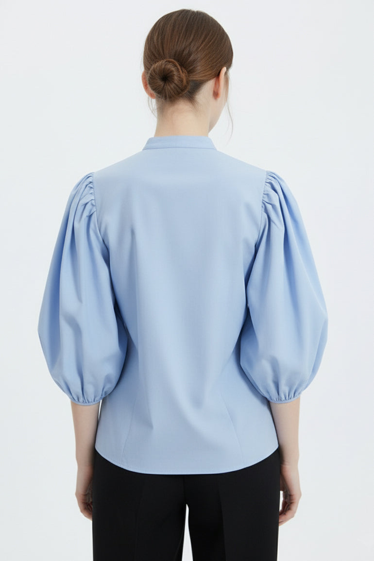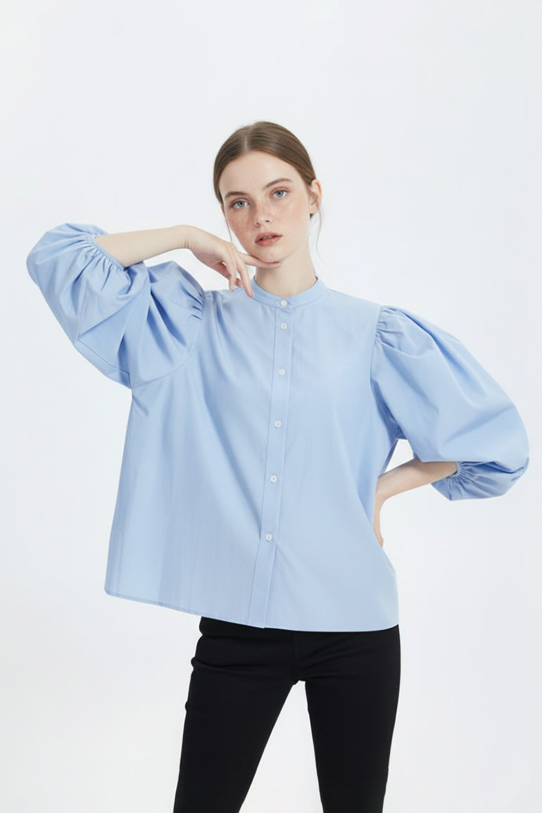 This elegant sky blue shirt brings a refreshing twist to classic tailoring. Made from premium cotton poplin, it features voluminous puff sleeves gathered at the cuffs, adding a soft, feminine flair to a structured silhouette. The clean button-up front and round neckline keep the design minimal yet sophisticated — perfect for both casual and semi-formal looks.