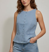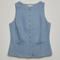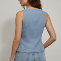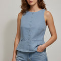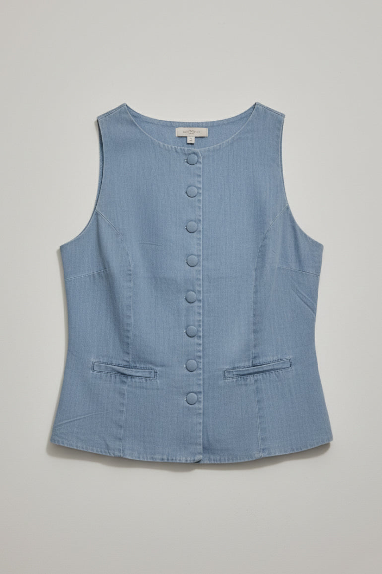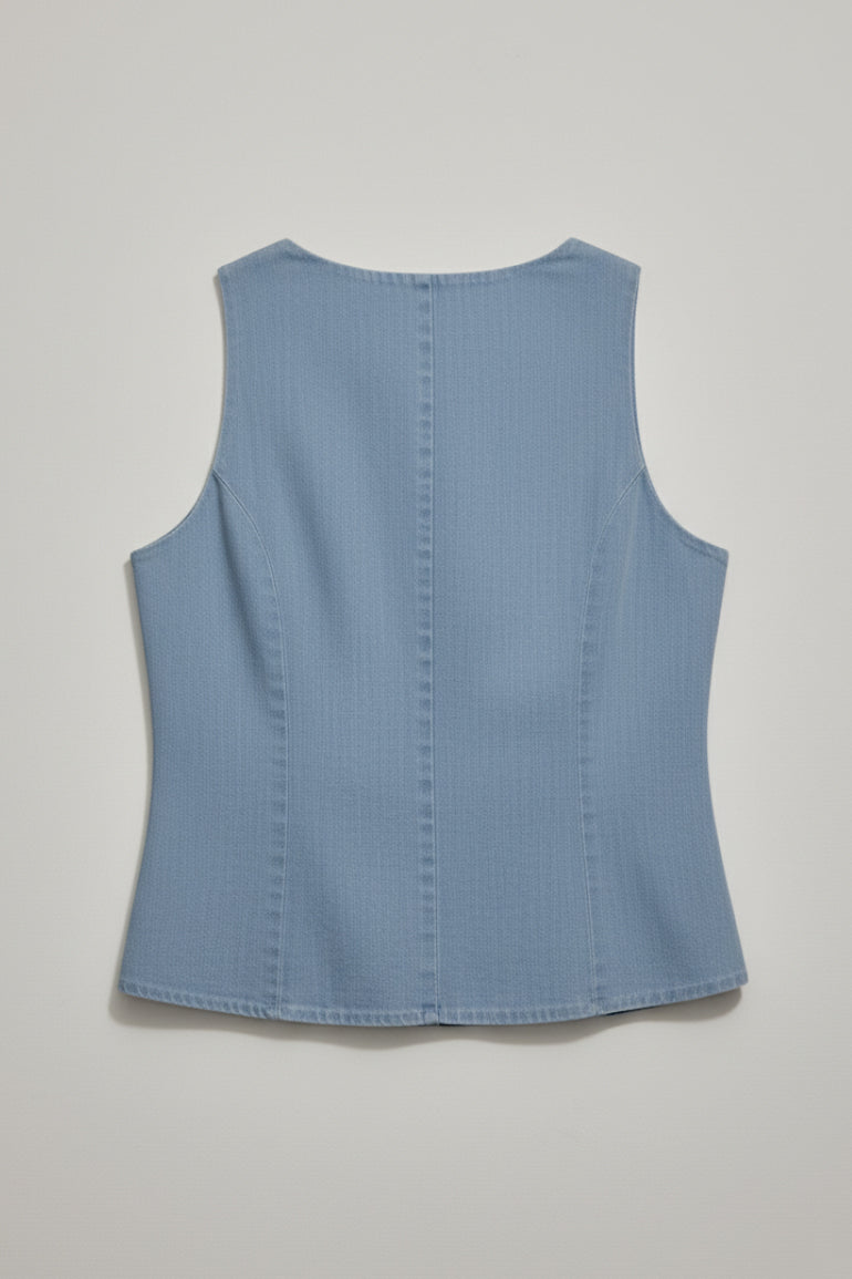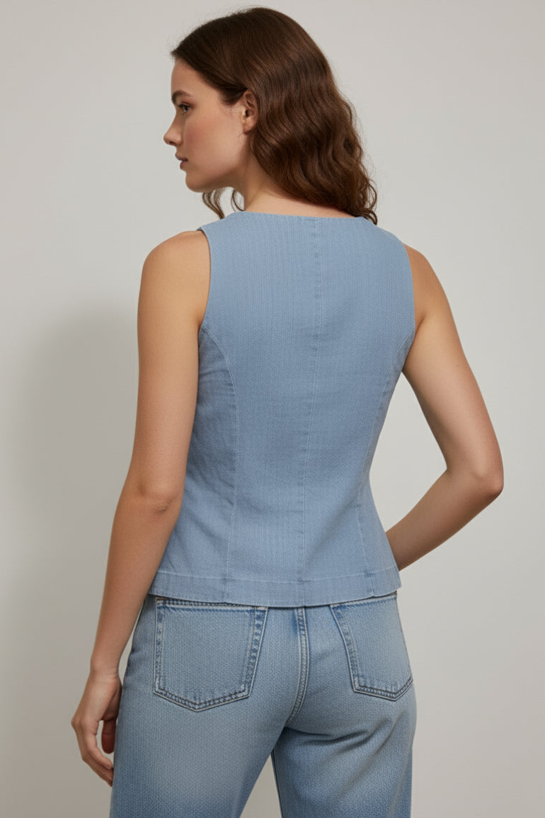 Refined, minimal, and effortlessly modern — this Sleeveless Button-Front Top is crafted for days when simplicity meets sophistication. Tailored in a structured yet comfortable cotton-blend fabric, it features a round neckline, front button closure, and slim contouring seams that flatter the form. The clean indigo hue adds depth and polish, making it a perfect transitional piece from work to weekend.