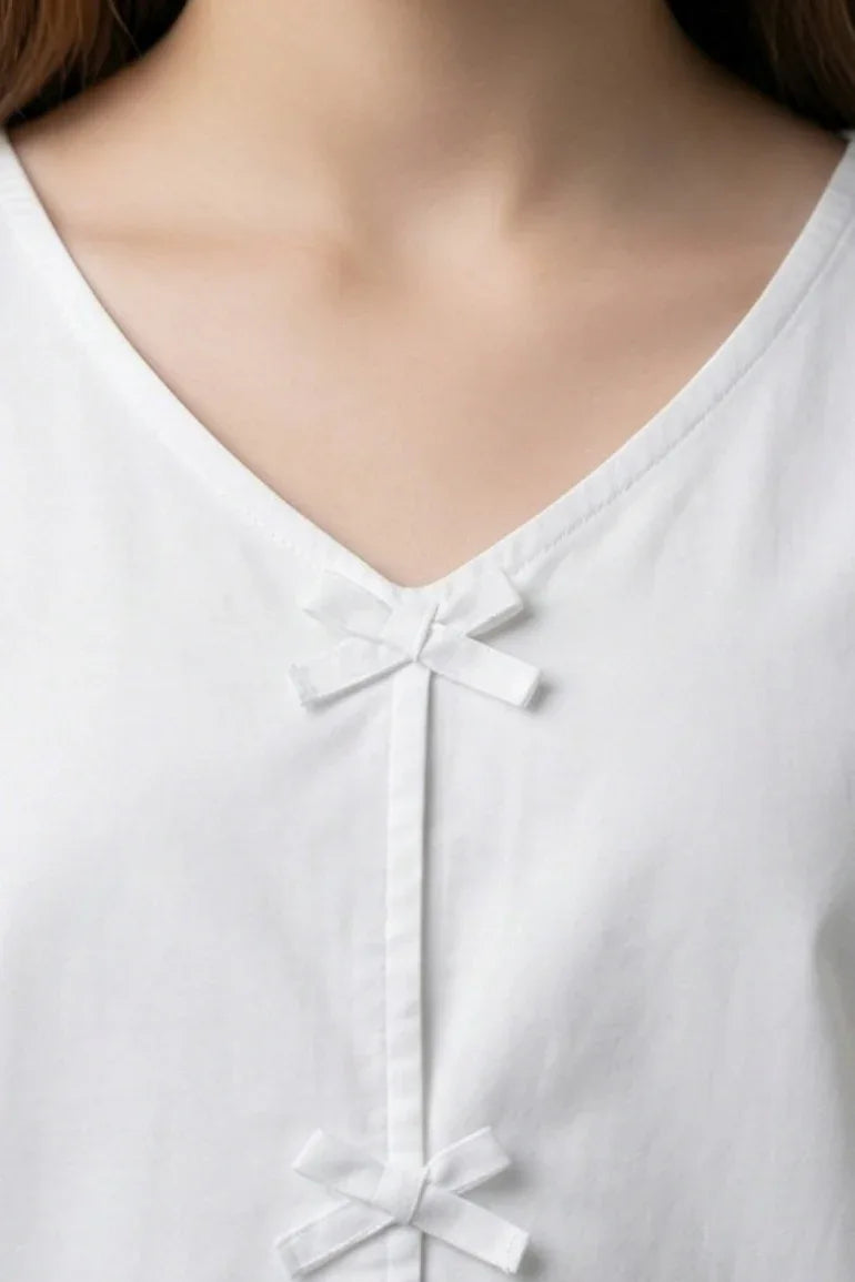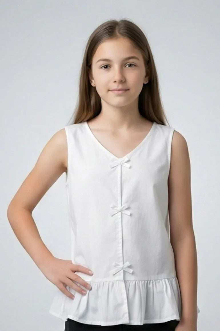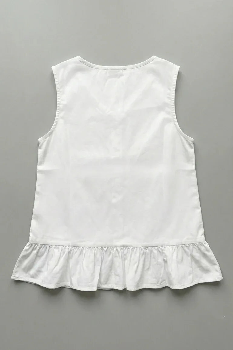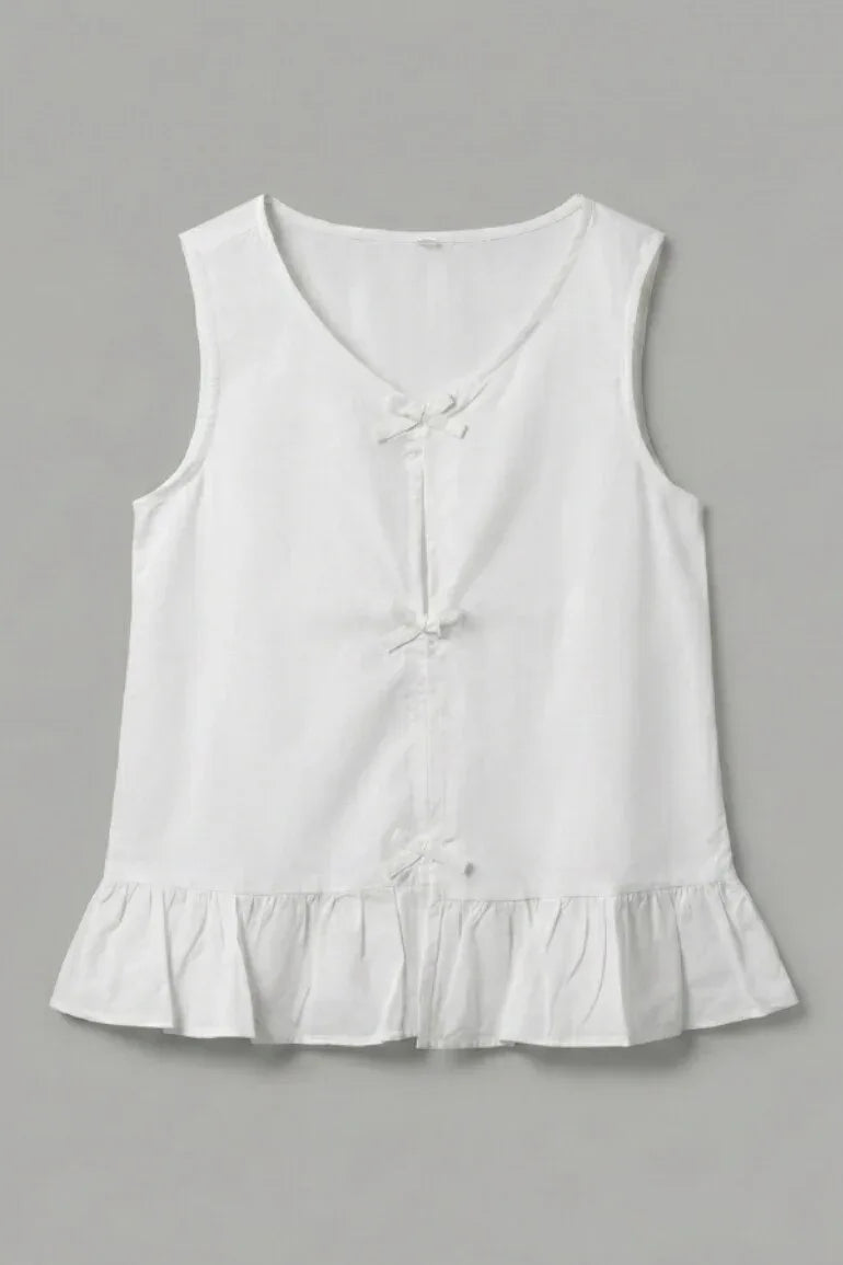 A soft and elegant sleeveless white top featuring delicate bow accents down the front and a gentle peplum hem. Perfect for casual days or dressy outings with a comfortable, airy fit.