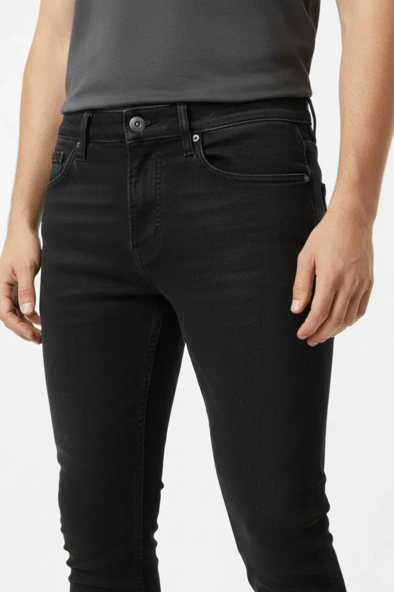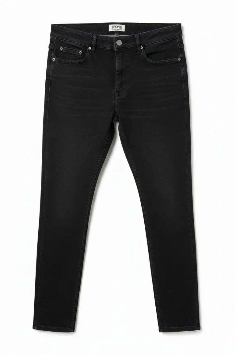 A sleek pair of jet black slim-fit denim jeans designed for a modern, clean silhouette. Crafted with comfortable stretch and a refined finish, these jeans are perfect for everyday wear and smart-casual styling.