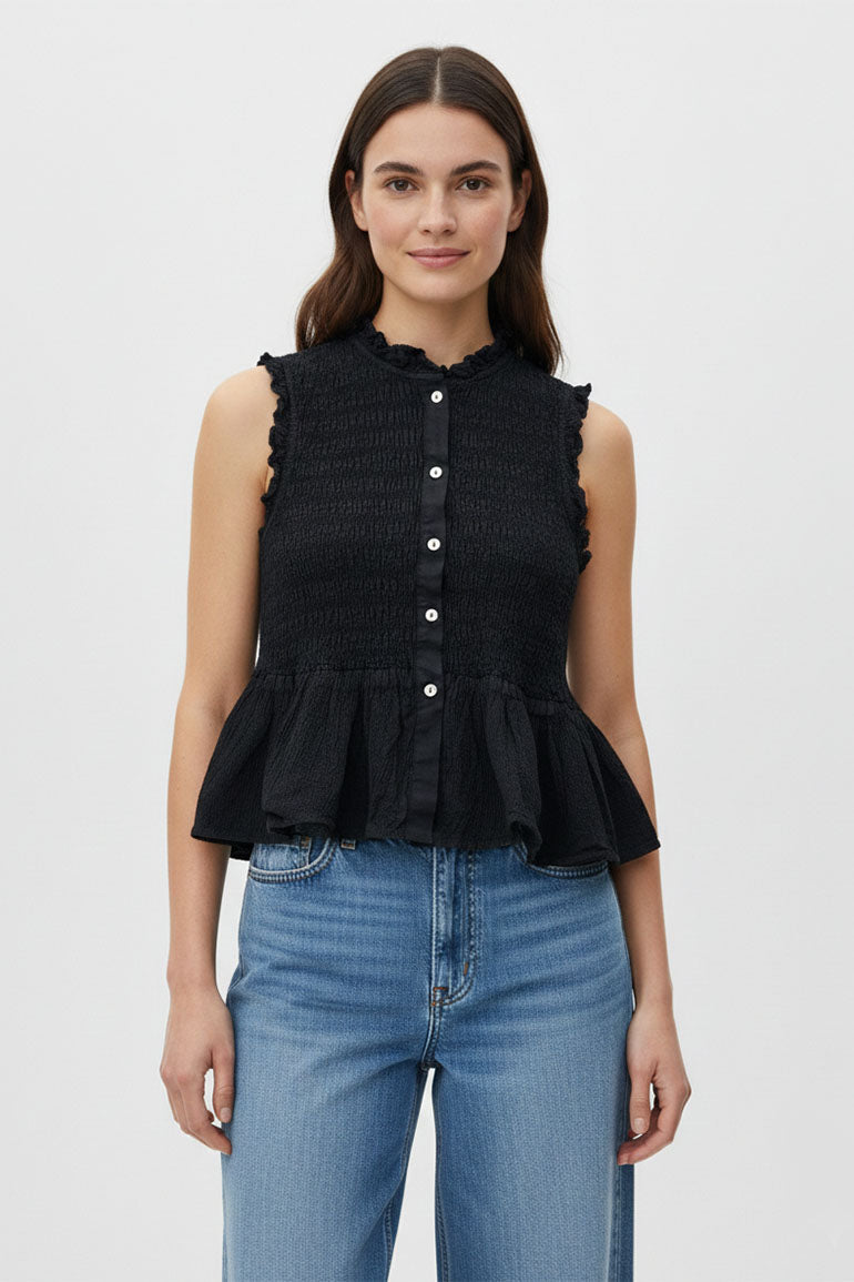 A sleeveless smocked top with front button detail and soft peplum flare. Designed with a flattering fit and feminine silhouette, perfect for casual outings or chic everyday styling.