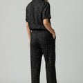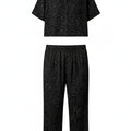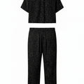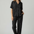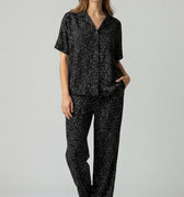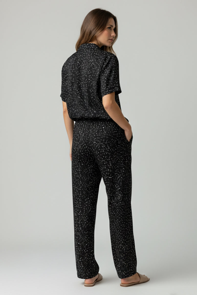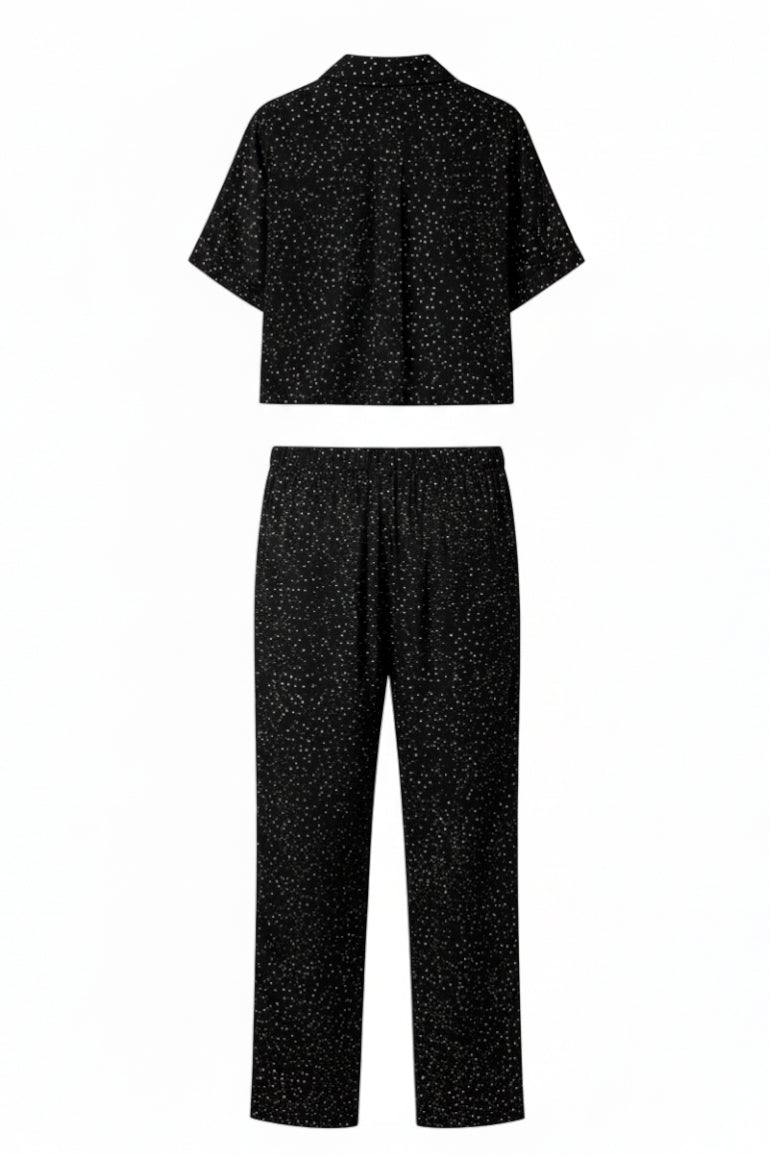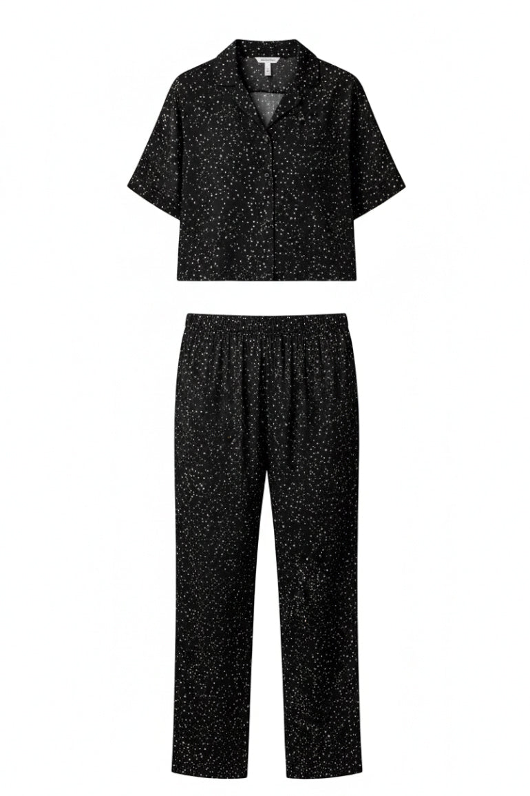 Relax in effortless style with this black star print pajama set, featuring a button-down short-sleeve shirt and straight-leg pants. Made from soft, breathable fabric for all-night comfort, this chic set blends cozy ease with a touch of celestial charm.