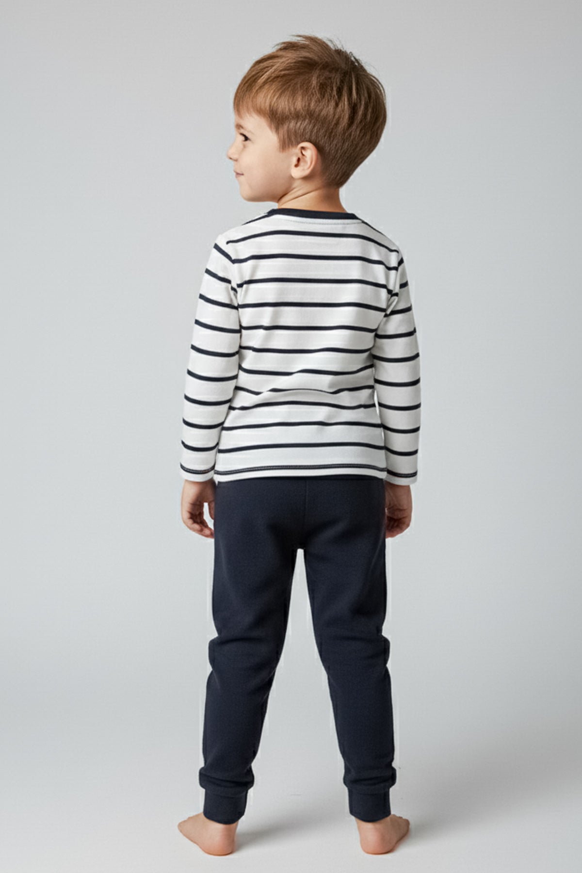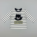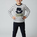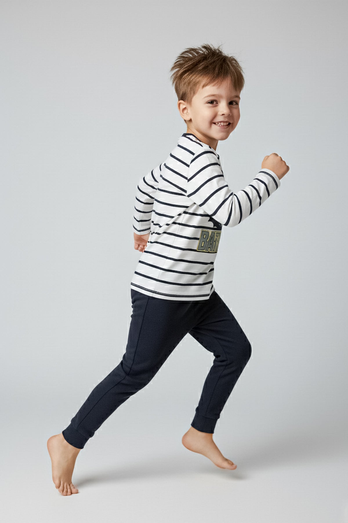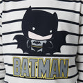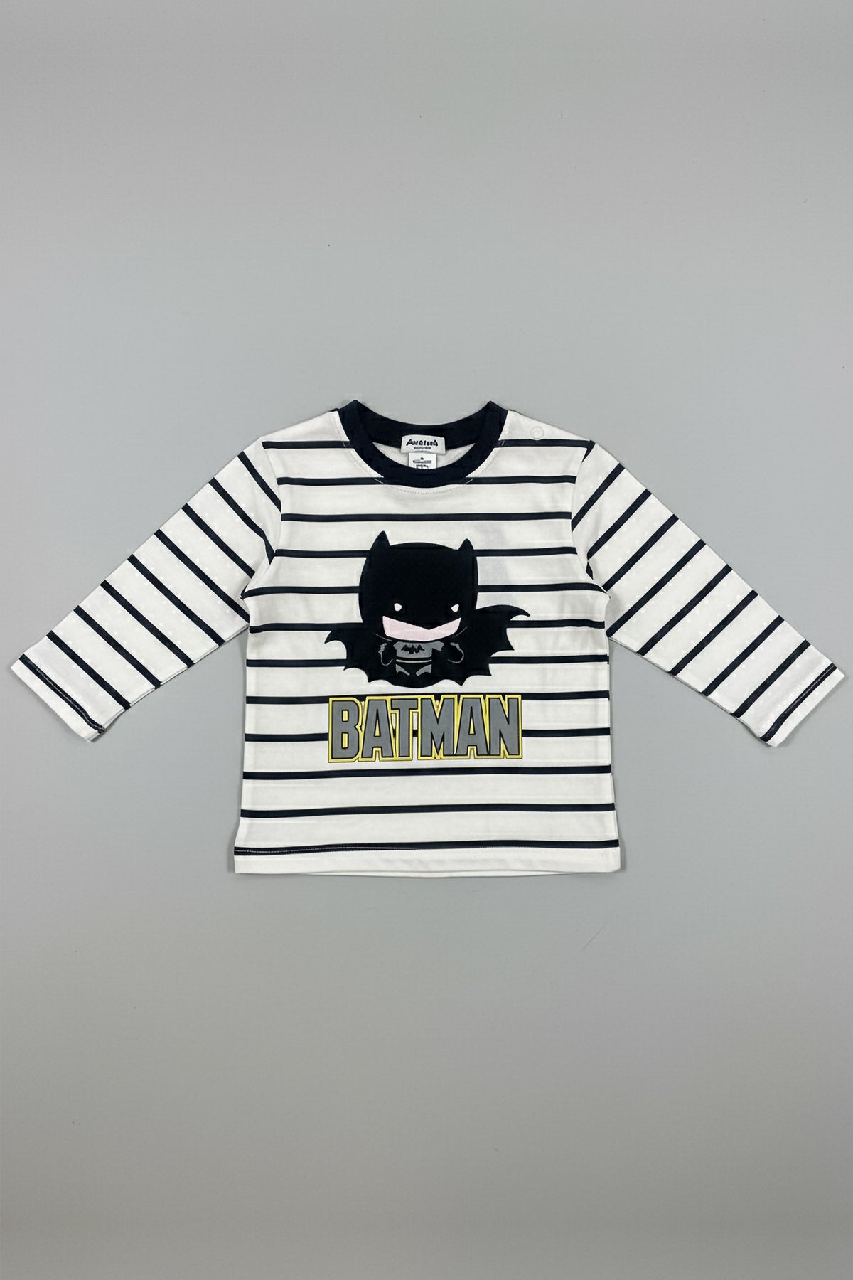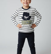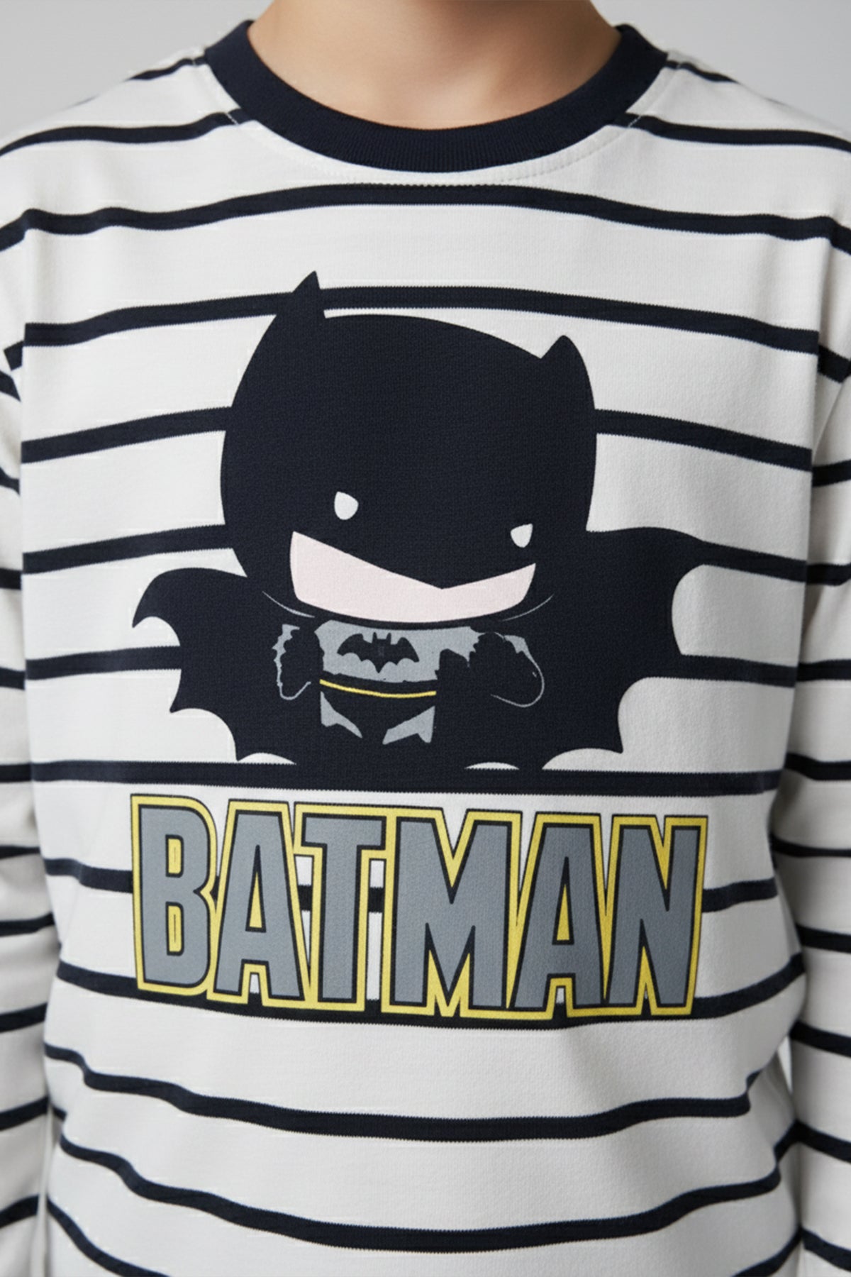 Give your little one a superhero upgrade with this Batman striped long sleeve t-shirt, crafted from 100% soft cotton for all-day comfort. Featuring a black-and-white striped base with a bold Batman print and logo, it’s the perfect mix of casual style and superhero fun.