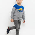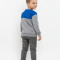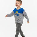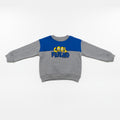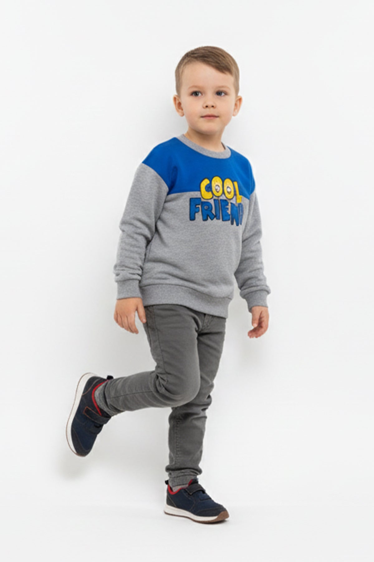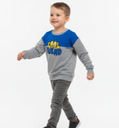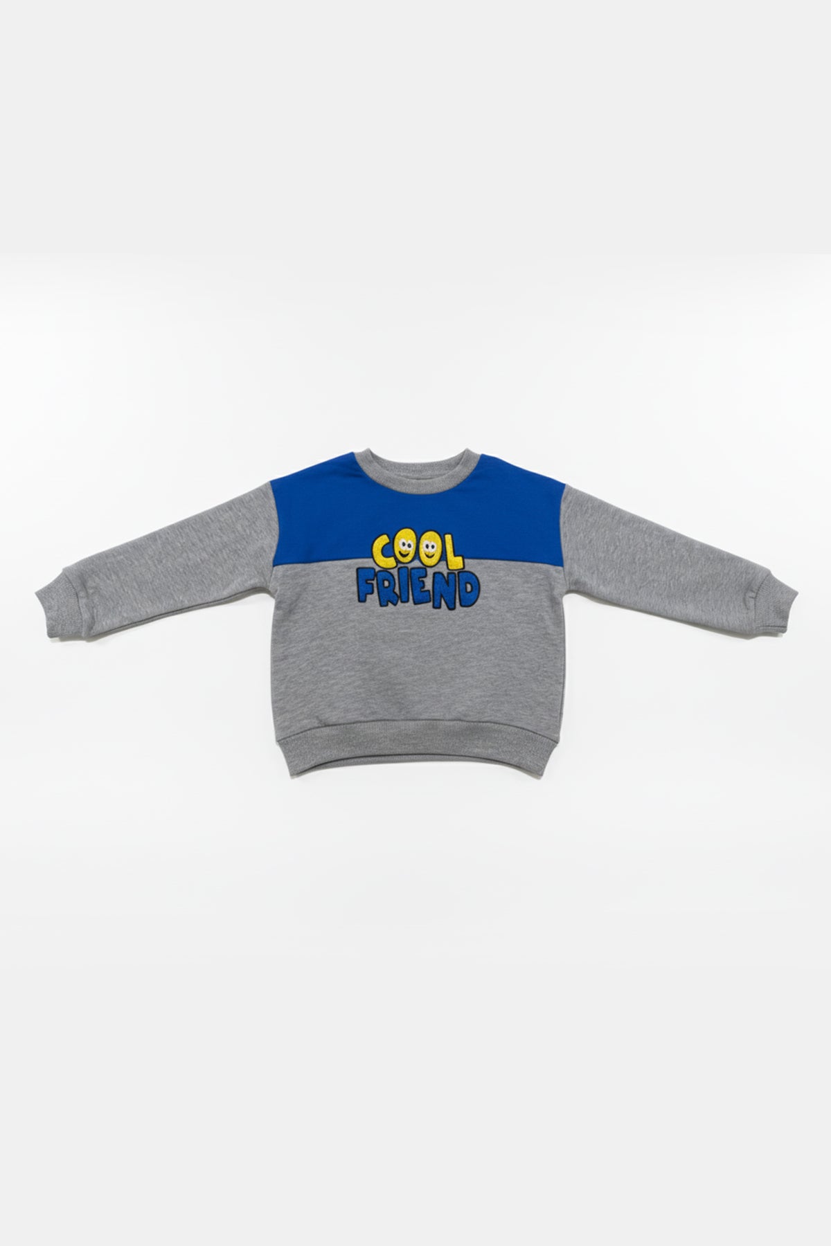 This cozy sweatshirt for boys features a fun “Cool Friend” embroidered graphic on a soft grey base with a bold blue panel across the chest. Made from warm and breathable fabric, it offers all-day comfort and a relaxed fit.