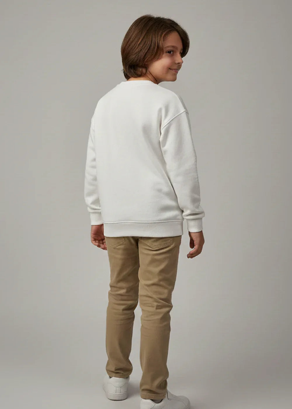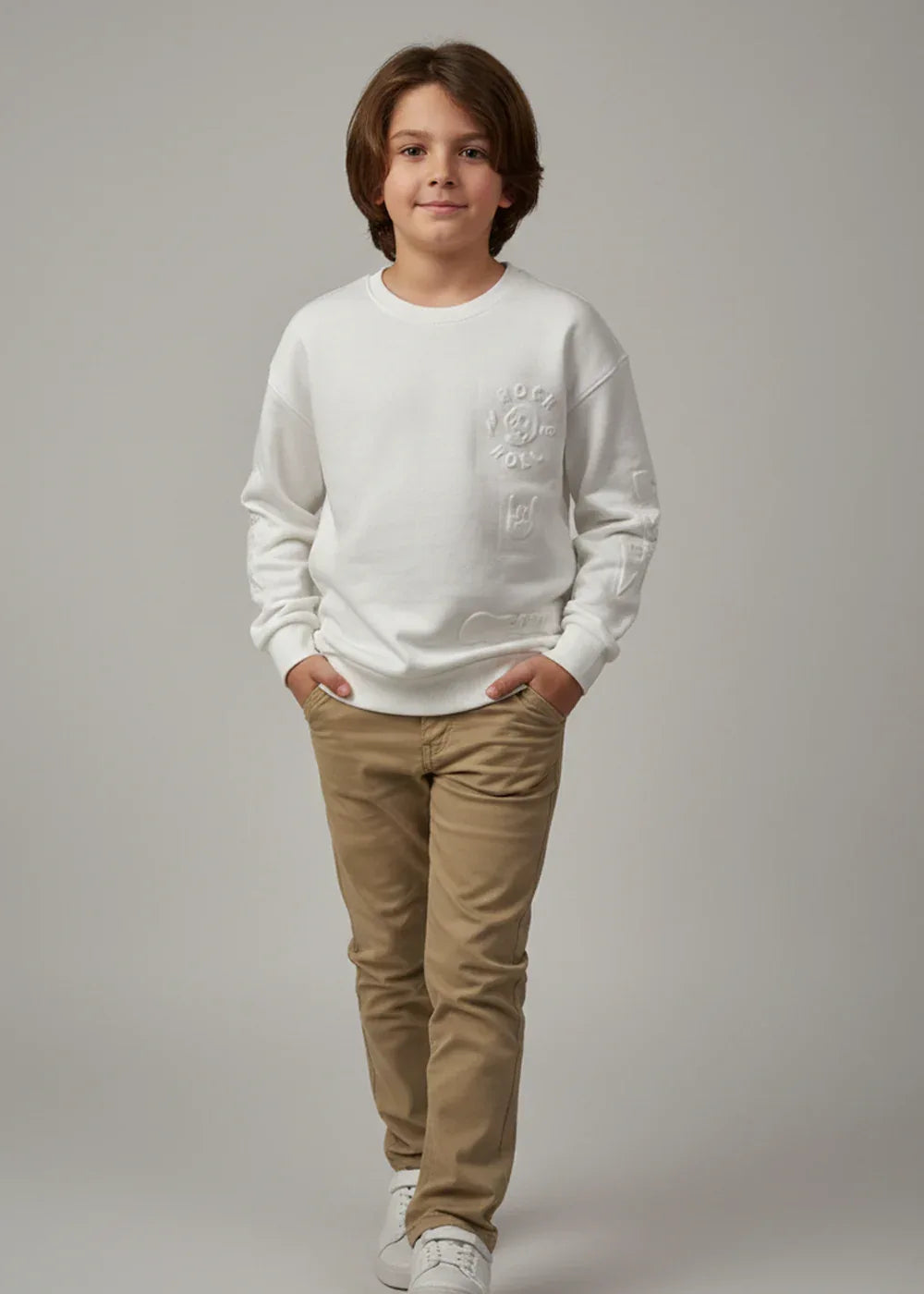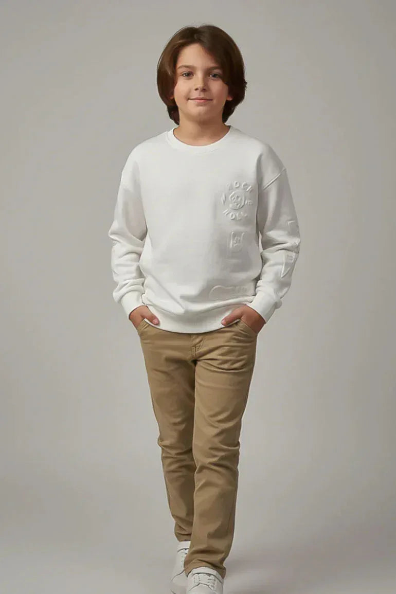 A clean off-white sweatshirt featuring subtle embossed detailing for a modern, minimal look. Crafted from soft, comfortable fabric thats perfect for all-day wear. Ideal for casual outings, school days, and easy everyday styling.