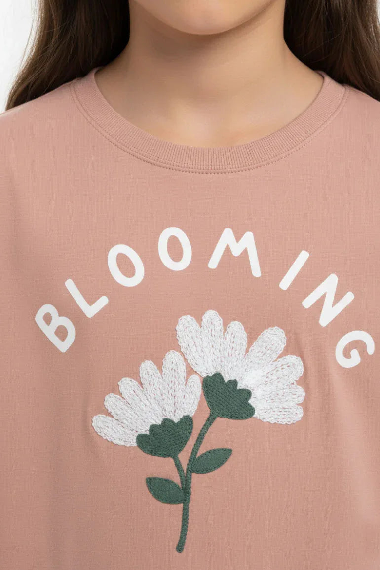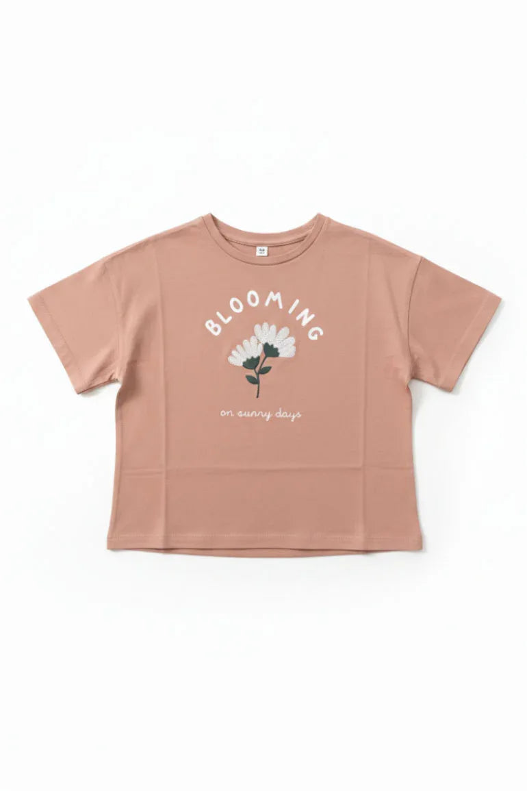 Charming dusty pink T-shirt for girls featuring a delicate floral graphic with “Blooming on sunny days” text. Designed with a relaxed fit and soft, breathable fabric for everyday comfort. Perfect for casual styling and playtime wear.